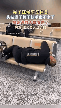 大哥的神操作差一点没赶上火车。 男子在候车室等火车,为了舒服躺在座椅上,还把头伸进椅子的把手里。 要检票了,听到火车检票通知,男子想起却起不来了,原来他的头卡在座位的铁把手里,动弹不得。 大哥拼命挣扎,满脸通红,真不明白当初他是怎么把头塞进去的。