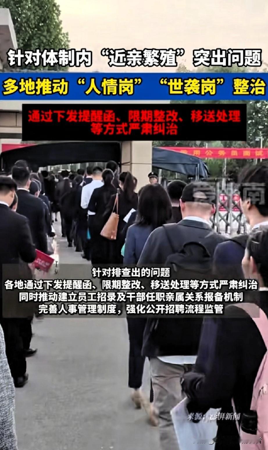 大快人心!国企岗位“世袭”终于要被整治了! 铁饭碗再也不是关系户的专属福利了! 以前总听人吐槽,身边有本事的年轻人,笔试面试样样过关,最后却输给了“有关系的”。国企岗位成了亲戚间的内部消化,普通人再努力也白搭! 现在各地开始严查“近亲繁殖”,真的太敞亮了! 湖北孝昌排查6家国企338名职工,揪出2条违规线索直接移送处理;内蒙古霍林郭勒“一人一档”审核7441人,13人完成任职回避调整!还有地方直接开通举报渠道,让群众盯着,彻底断了“人情岗”的后路! 那些限定奇葩条件、专为领导亲属量身定做的“萝卜坑”,终于要凉凉了!公家的岗位本就该凭本事竞争,这样的公平环境,难道不是每个奋斗者都盼着的吗? 你身边还有没有见过这种“人情岗”的离谱事儿?
