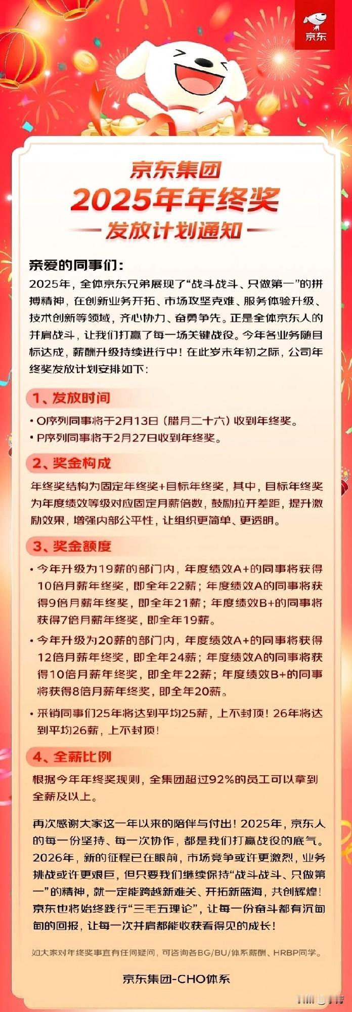 昨晚看到京东的年终奖 不得不说打工人的我羡慕了 可以拿19薪的 26薪的甚至上不封顶 总投入同比暴涨70% 92%员工能拿满超额奖励 这哪里是发年终奖 分明是企业对员工的真心回馈 京东这波操作不是跟风作秀 而是连续7次加码薪酬福利的延续 连一线员工都能在年前稳稳拿到年终奖这样的诚意才是留人的关键 企业和员工从来不是单向索取 你愿意为员工的付出买单 员工才会拼尽全力为企业创造价值 这不是大方是共赢的智慧 现在满屏都是羡慕的声音[笑哭]