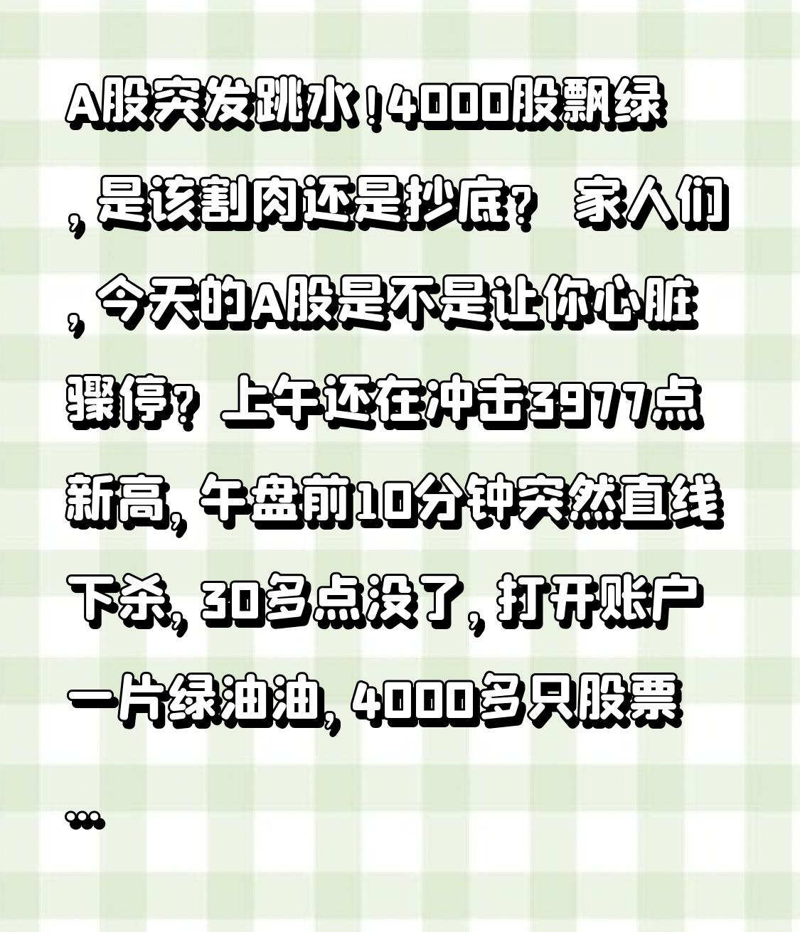 A股突发跳水!4000股飘绿,是该割肉还是抄底? 家人们,今天的A股是不是让