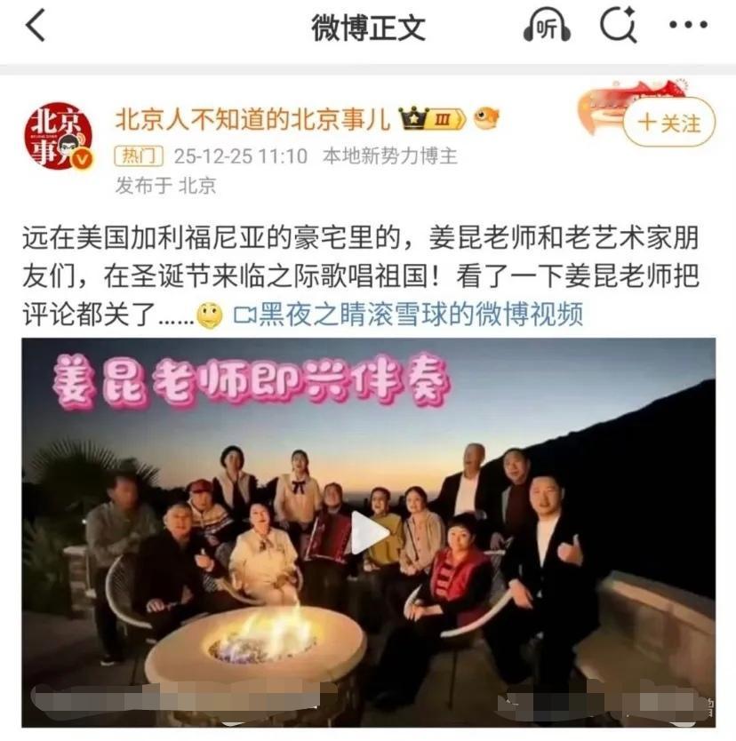 【此生无悔入华夏】 又是一年圣诞节,德艺双馨的著名相声演员姜昆,在其远在加利福尼亚的豪宅里,和一群老艺术家朋友们,篝火阑珊,尽情的歌颂我们伟大的祖国。 真可谓是: 此生无悔入华夏, 家在加利福尼亚, 反美爱国是工作, 远渡重洋是生活。 工作生活要分清, 难得一颗赤子心, 水深火热大别墅, 西方模式切莫学。
