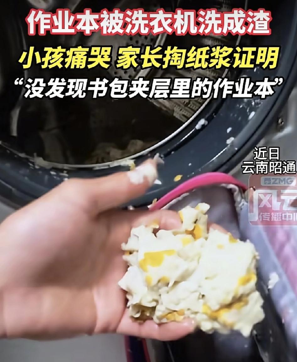云南邵通一位小学家长给孩子清食书包时,因为未发现书包里放有孩子的作业,然后把书包一起放到了洗衣机里洗,结果发现作业已被成搅成碎屑,孩子通知道之后非常伤心,家长无奈只好拍视频给老师证明孩子的作业是自己不小心洗掉了,老师看到之后也表示理解。