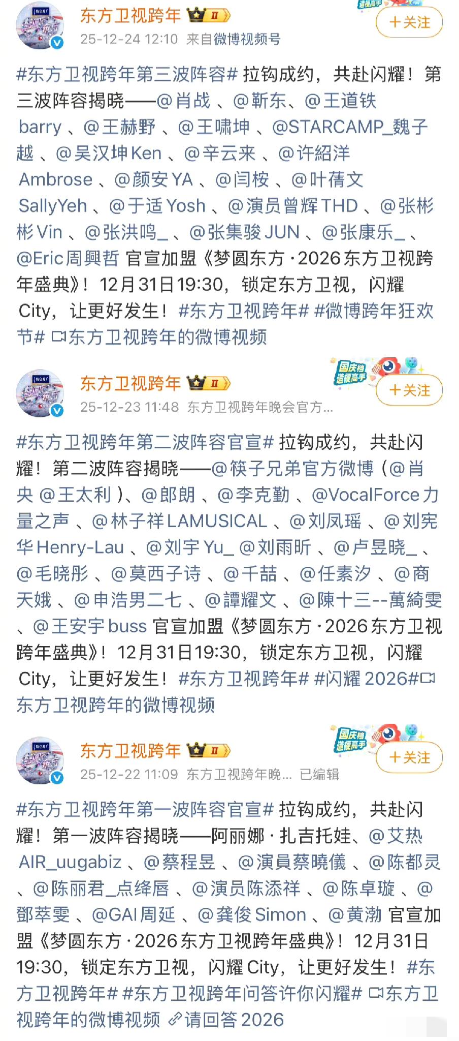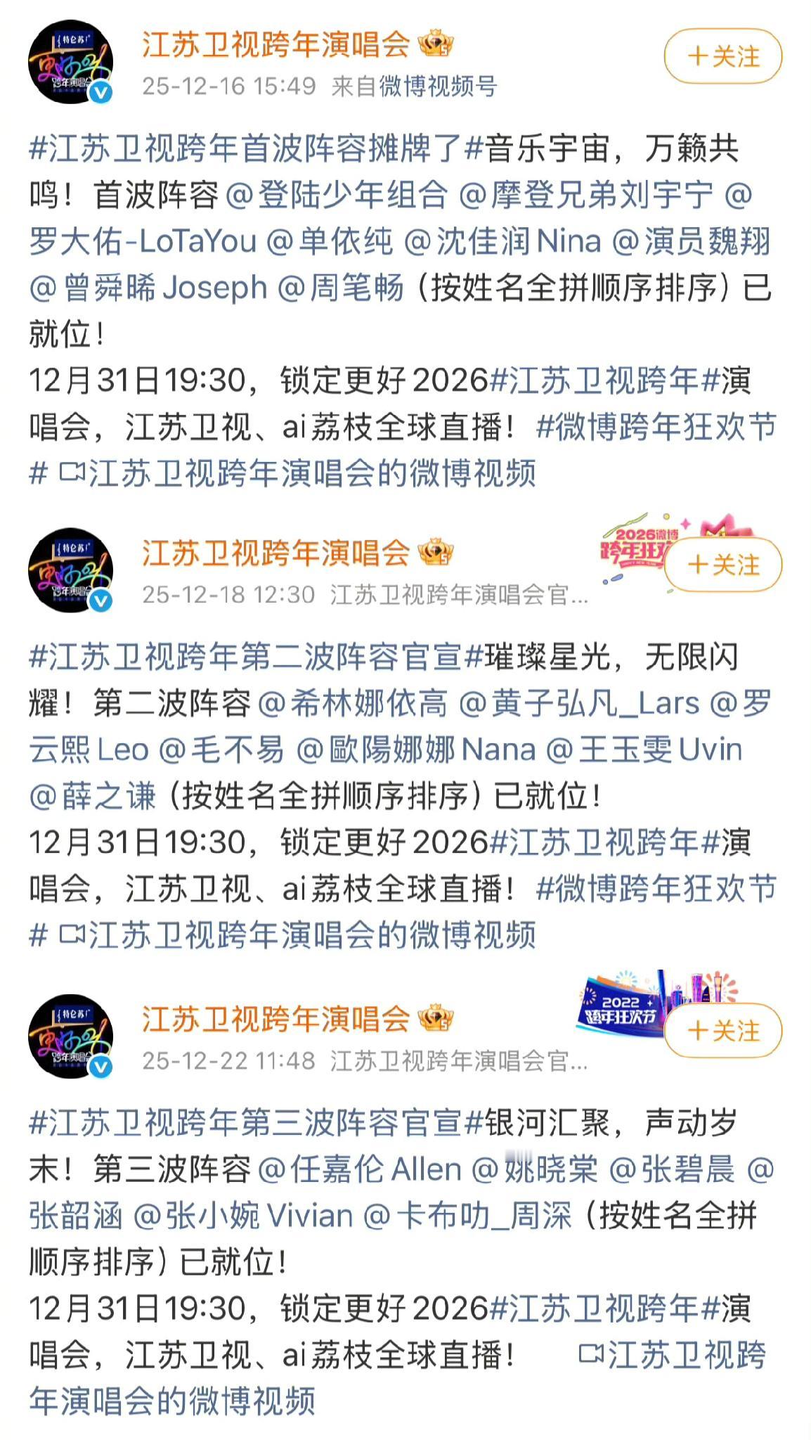 今年的跨年晚会四大卫视神仙打架,观众朋友们的遥控器又要忙起来啦! 每年的跨年晚会,就是检验歌手实力的时候到了,观众们最津津乐道的莫过于谁是真唱谁是假唱谁现场翻车谁超水平发挥,直播的现场就像一面照妖镜,庐山真面目一照便知。 今年的湖南卫视依旧是直播,集结了三屇歌王,那英,华晨宇,陈楚生,还有众多的中生代和新生代,陶喆,王心凌,时代少年团,全都是湖南卫视的熟悉面孔,可以说是你想看的全都有, 江苏卫视最大牌是罗大佑,更有李宇春,薛之谦,毛不易,单依纯等实力唱将。 浙江卫视有张信哲,韩庚以及跑男成员和种地吧少年! 东方卫视则牢牢掌握流量密码,首播阵容就官宣了肖战,以及叶倩文林子祥夫妇,更有陈丽君,黄勃,任素汐等各个领域的顶尖人物,星光熠熠! 几家卫视各有所长,但是也是有直播有录播,优先看直播,欢乐多多!跨年晚会图鉴 湖南台跨年舞台 芒果跨年晚会 东方卫视