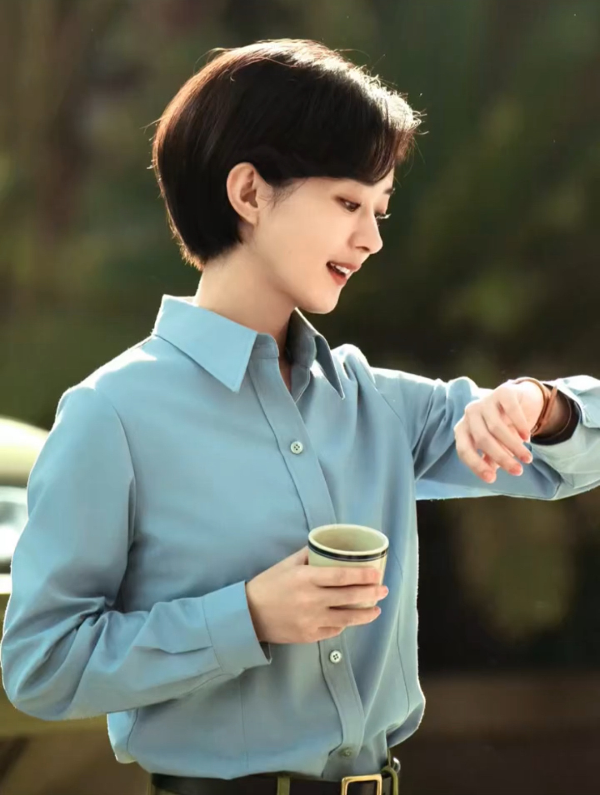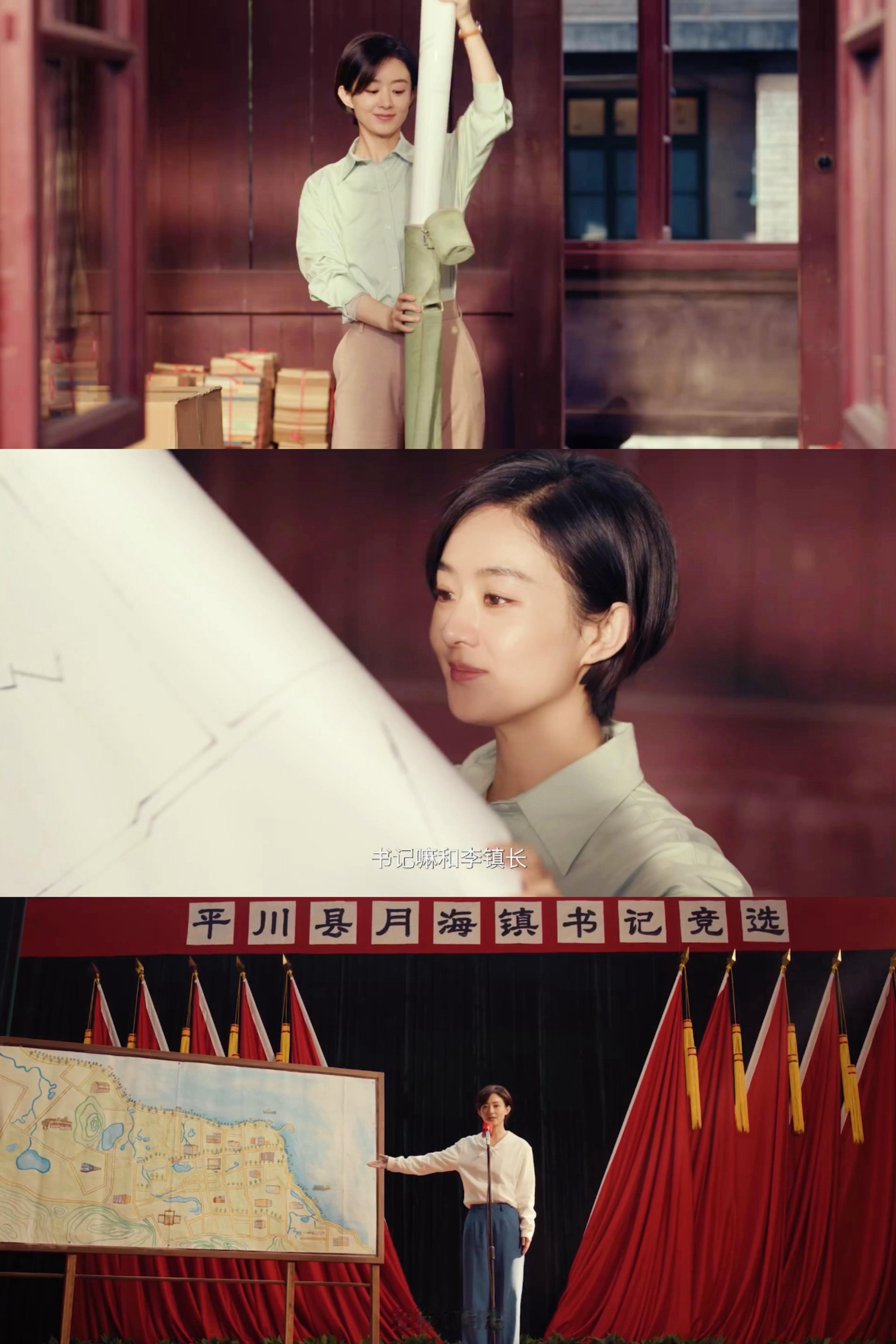 赵丽颖小城大事妆造赵丽颖黄晓明拉帷幕海报娇俏可爱,干练利落,短发造型非常好看,和传统意义上严肃一本正经的干部形象形成反差萌!