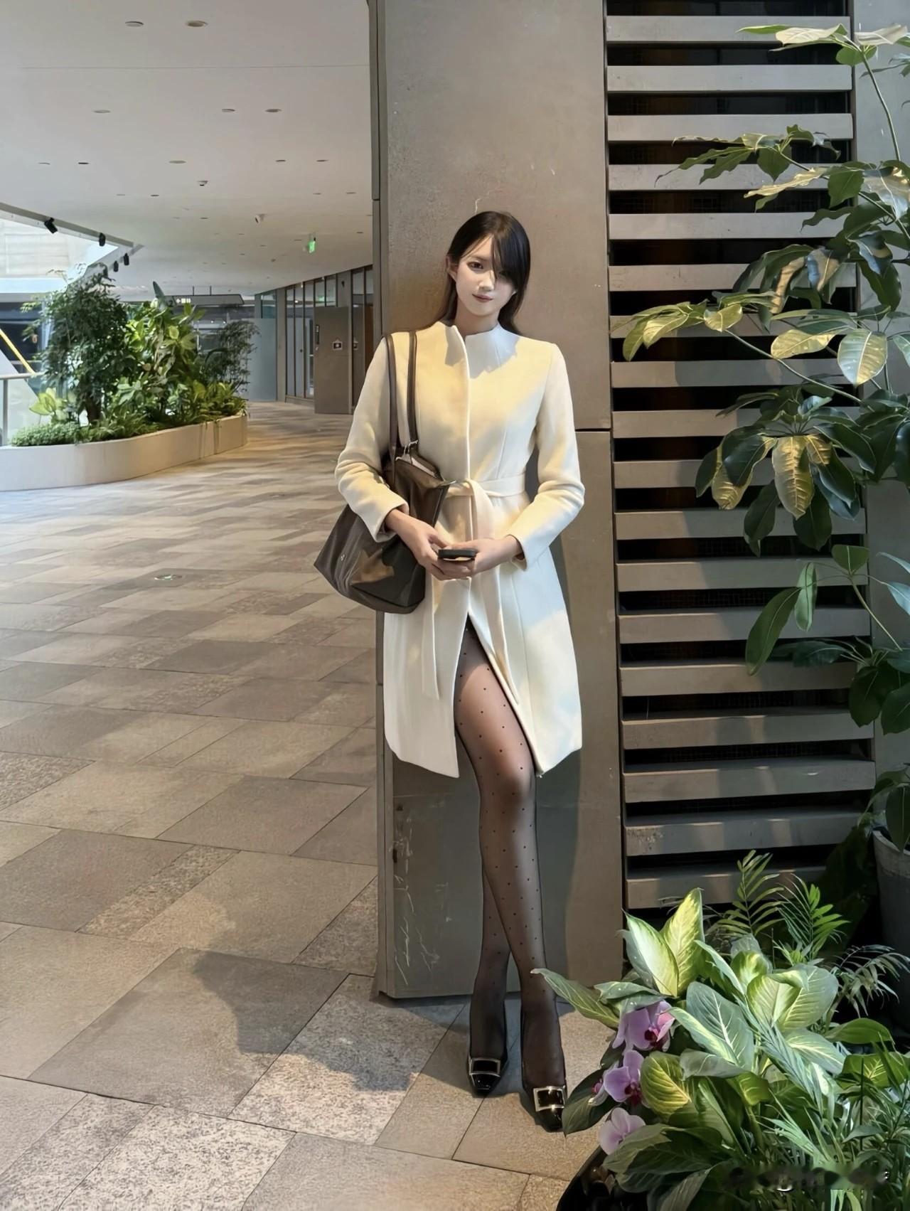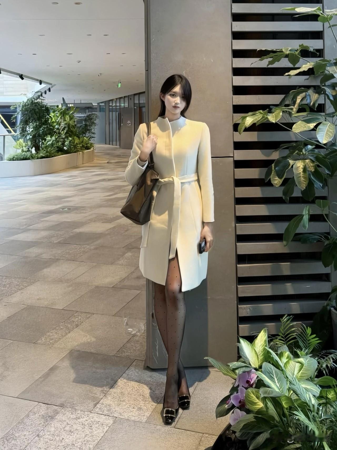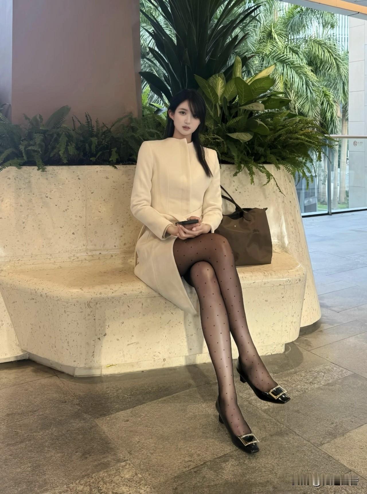 优雅都市风,黑白点袜搭配米色连衣裙,时尚感满满!