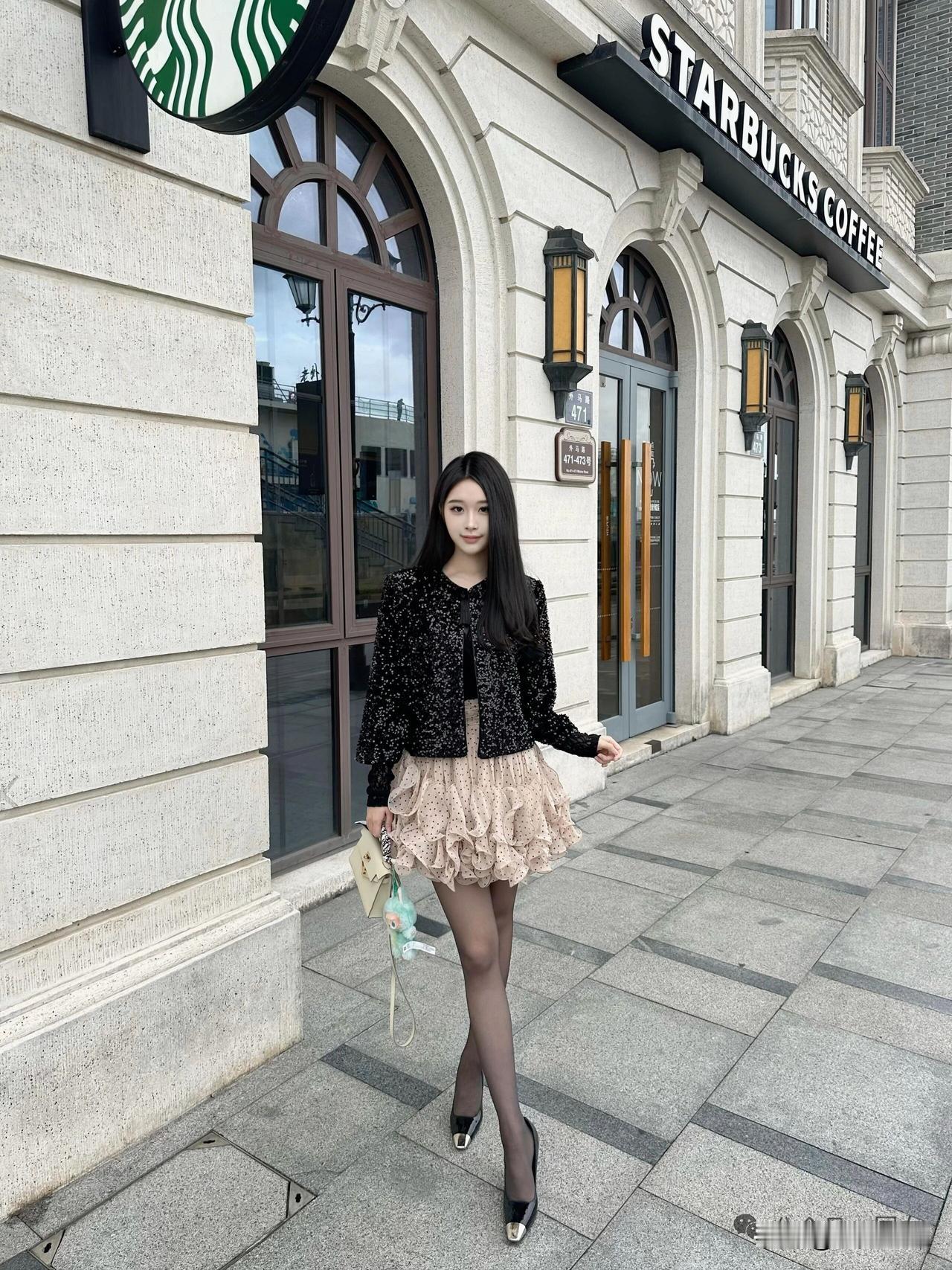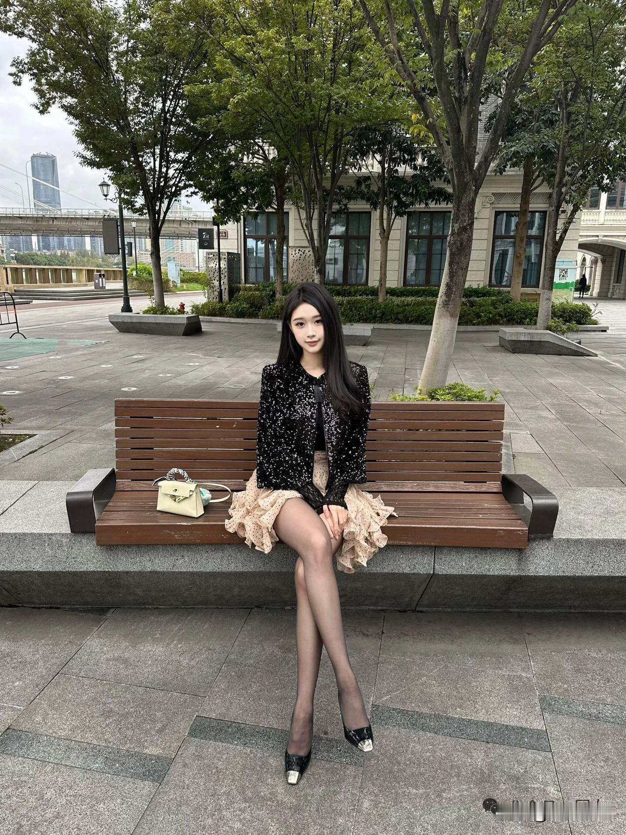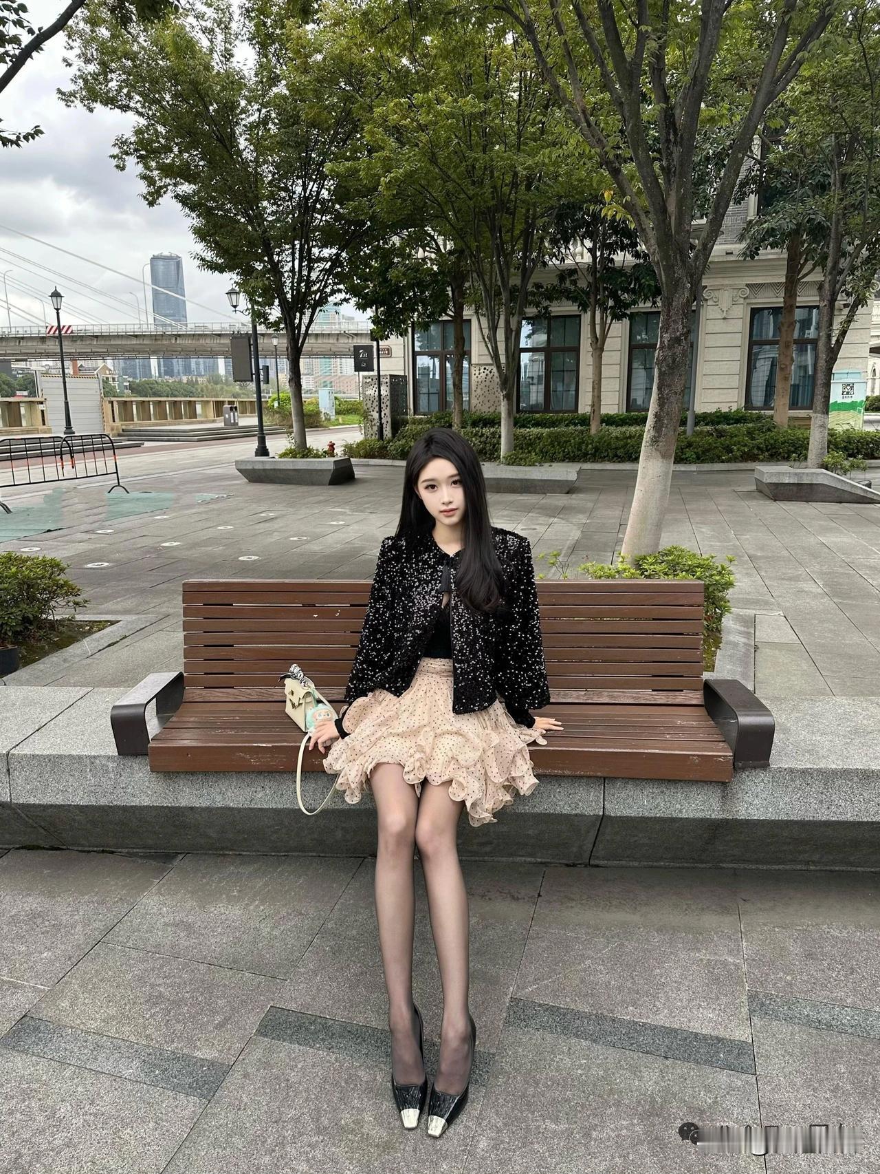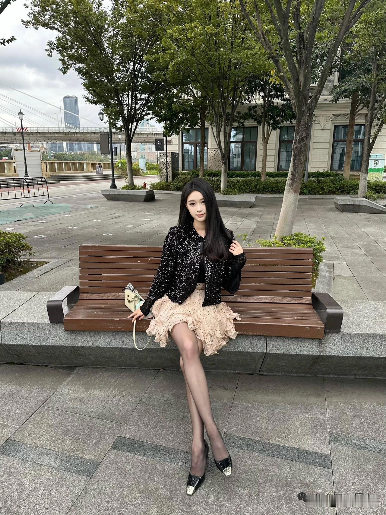 都市雅致风,黑纱外套+粉色裙摆,优雅坐长椅,尽显时尚魅力!气质穿搭怎么穿才恰到好处?
