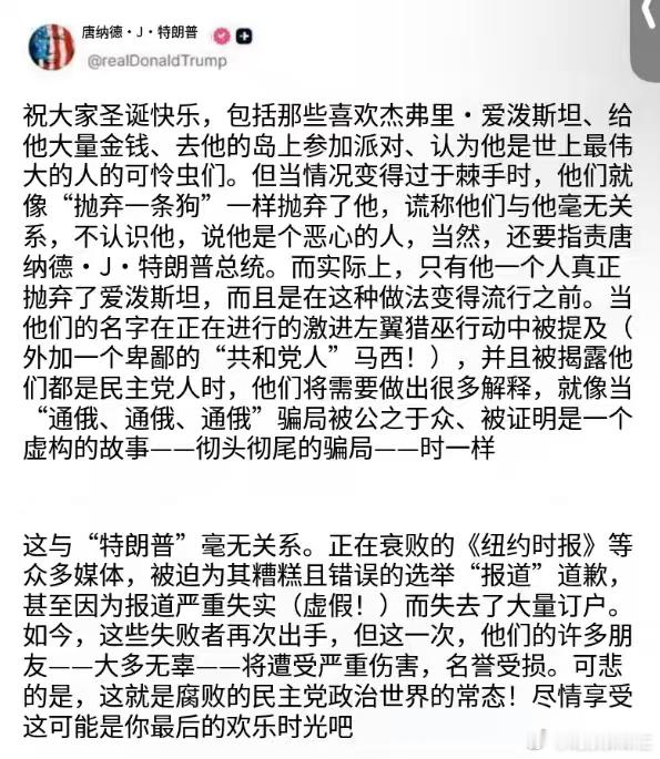 特朗普在圣诞节这一天利用社交媒体发表意见直指某知名媒体造假并报道虚假新闻,该媒体因此失去不少订户