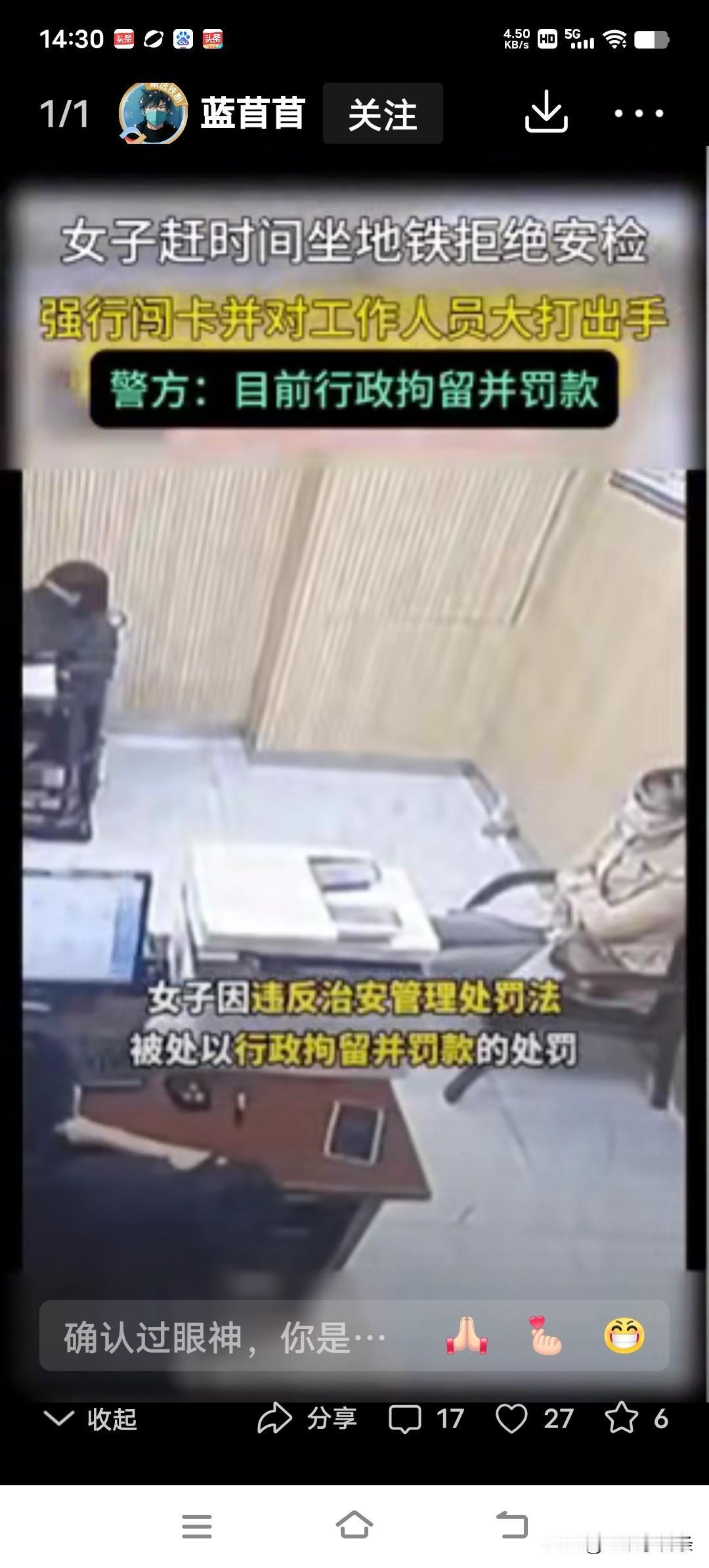 是谁给她这么大的胆量,太狂妄了,坐地铁安检是规则,任何人都要遵守,女子不仅不进行安检,强行闯卡,还对工作人员大打出手。 女子坐地铁以赶时间为由拒绝安检,并强行闯卡,工作人员提醒后,女子发疯了,对工作人员拳打脚踢,左右开弓扇工作人员耳光,还用手拽工作人员的头发,整个就是一个泼妇。 事后女子说因为家庭琐事心情不好,才导致情绪失控。 这根本就不是她无视规则、殴打他人的理由。 最终,女子因违反治安管理处罚法被拘留罚款,女子坐在派出所里接受处罚,她当初有多狂妄,现在就有多狼狈,完全就是咎由自取。