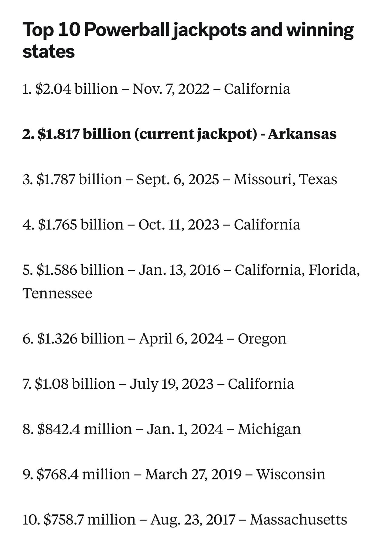 美国阿肯色州的一位强力球彩民在节日期间收到了一份难忘的礼物:据强力球彩票公司称,该州售出的一张彩票匹配了全部六个号码,赢得了 18.17 亿美元的头奖,这是美国彩票史上第二大奖金。