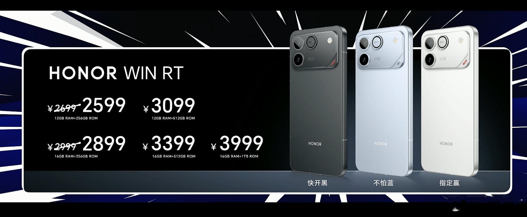 荣耀WIN RT(骁龙8至尊版)12+256 2599元12+512 3099元16+256 2899元16+512 3399元16+1T 3999元荣耀WIN(骁龙8 Elite Gen5)12+256 3999元12+512 4399元16+512 4699元16+1T 5199元大家感受下价格。新机来了