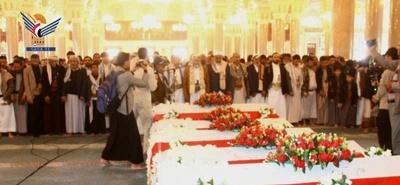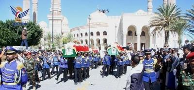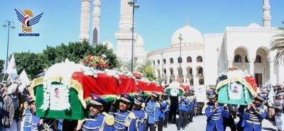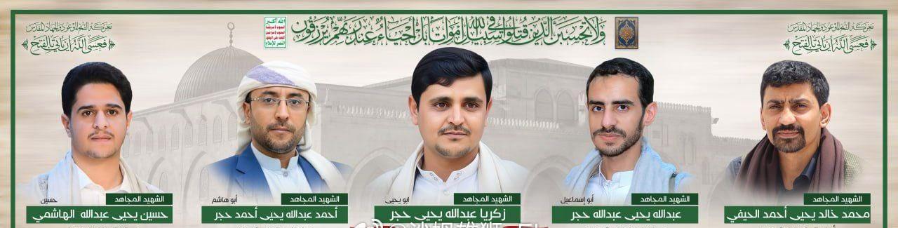 也门胡塞政府在萨那为5名今年三月在美军空袭中殉职的无人机部队指挥官和专家举行高级别葬礼: 1、扎卡里亚·阿卜杜拉·叶海亚·哈贾尔少将少将(无人机部队行动主管); 2、阿卜杜拉·叶海亚·阿卜杜拉·哈贾尔准将(扎卡里亚的兄弟兼助理); 3、穆罕默德·哈立德·叶海亚·艾哈迈德·海菲少将(无人机行动员); 4、艾哈迈德·阿卜杜拉·叶海亚·艾哈迈德·哈贾尔准将(扎卡里亚的兄弟兼助理); 5、侯赛因·叶海亚·阿卜杜拉·哈希米准将(无人机研究员)。