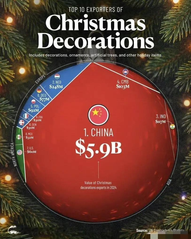 各国圣诞节饰品出口占比,中国几乎垄断全球市场,让人怀疑,圣诞节到底是谁的节日啊,西人都这么没情怀吗?连简单的饰品都生产不了了吗?还是看不上这个市场? 很难想象,哪天中国人去买春联,而春联是国外进口的,对中国人来说这就是奇耻大辱,西人似乎没这种纠结,那是因为他们文化太浅。