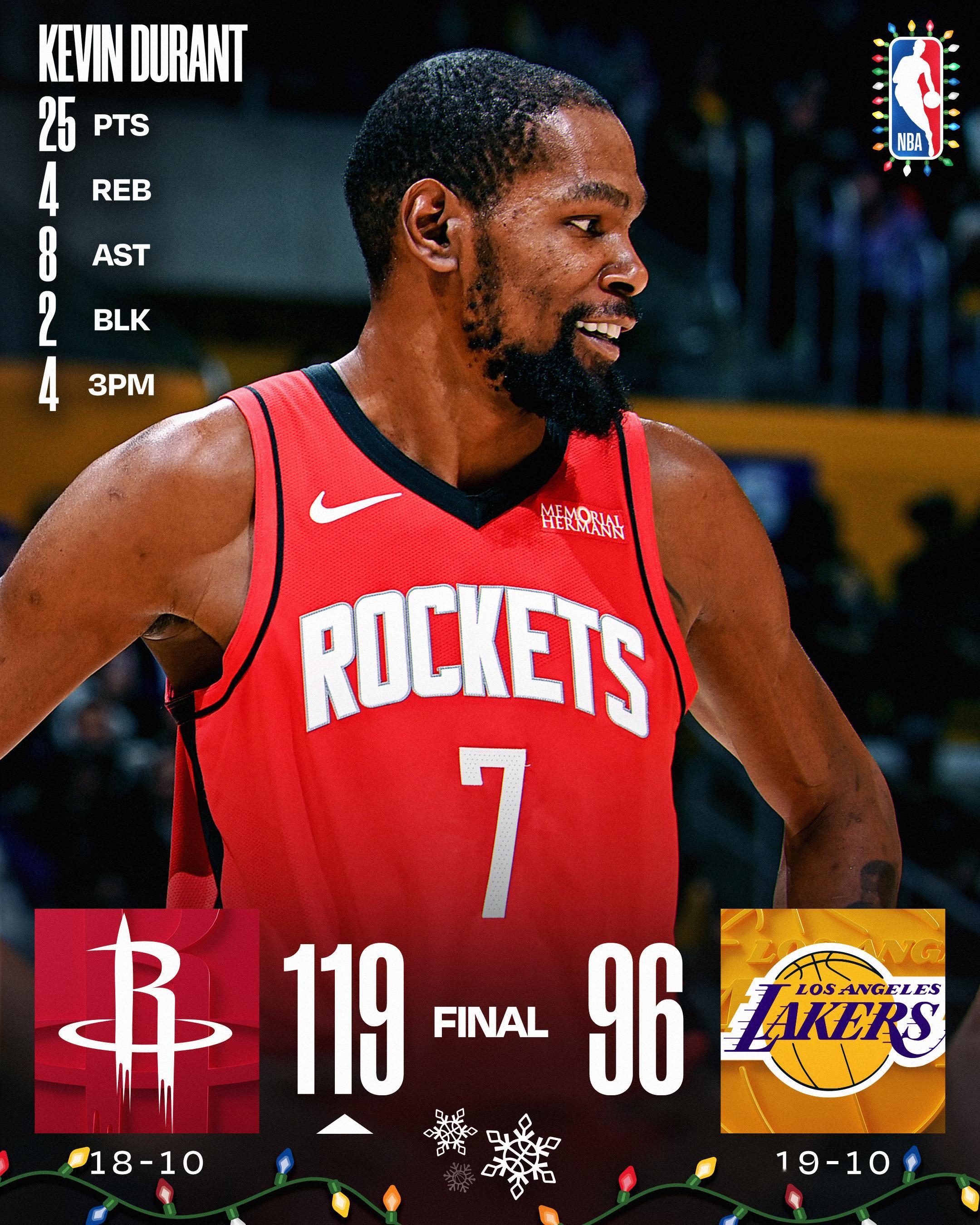 ——杜兰特25分4篮板8助攻1抢断2封盖,生涯第479次单场25+且命中率50%+,超越乔丹升至历史第4——阿门汤普森26分7篮板5助攻1抢断,成为火箭队史第4位在圣诞大战中砍下25+得分5+篮板5+助攻的球员NBA圣诞大战 火箭客胜湖人
