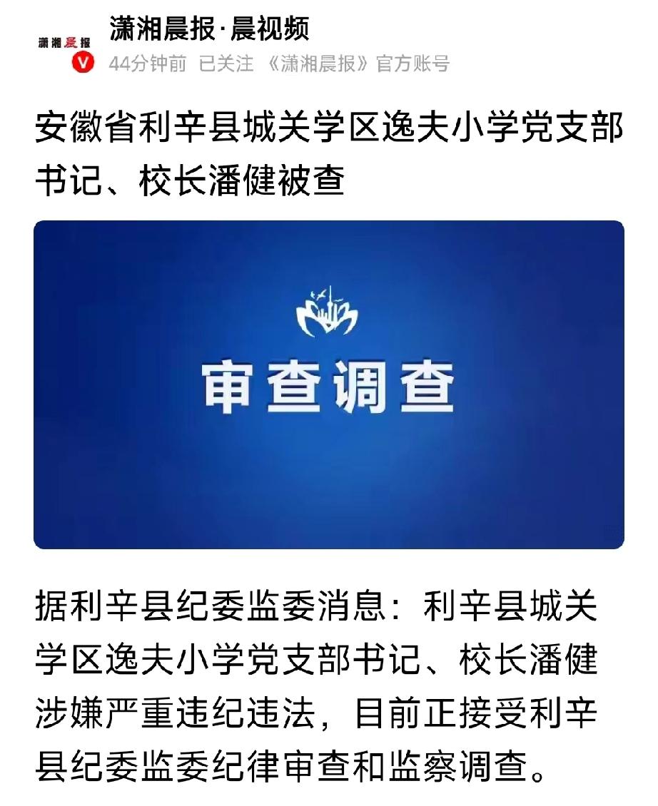 利辛县的潘健,今天彻底“翻车”了。 这个潘健不简单,他之前是安徽省亳州市利辛县城关学区逸夫小学党支部书记、校长。 大家可别小瞧了一个小学的校长,有时候小学校长的权力可不小。 这里的城关学区逸夫小学,是利辛县城关镇的一所全日制公办学校,该学校始创于1965年,距今已有近60年历史。学校规模也不小,现有56个教学班,在校学生达到了3289人。教职员工131人,其中本科学历95人,高级教师12人。 这个潘健,在担任校长期间,还经常到贫困户家中走访,当时还登上了亳州晚报,标题就是用真情、扶真贫。 可见他还是很善于伪装的,是一个十足的“双面人”。 就在今年的4月份,还有关于他的公开活动消息。 当时正值4月1日,利辛县城关学区逸夫小学开展清明缅英烈“逸”在行动,当时他带领党员同志和优秀少先队员代表前往利辛县烈士陵园开展“红色精神永流传,革命薪火代代传”主题研学活动。 没想到人都有两面性,一面是正常人格,一面又是暗黑人,正面人格善良,暗黑人格,贪婪伪善。 阳光大道不走,非要走那独木桥,如今官宣消息的发布,也预示着他的好日子将彻底终结于今天,校长生涯也将彻底终结,未来长路漫漫,唯有与铁窗为伴了。