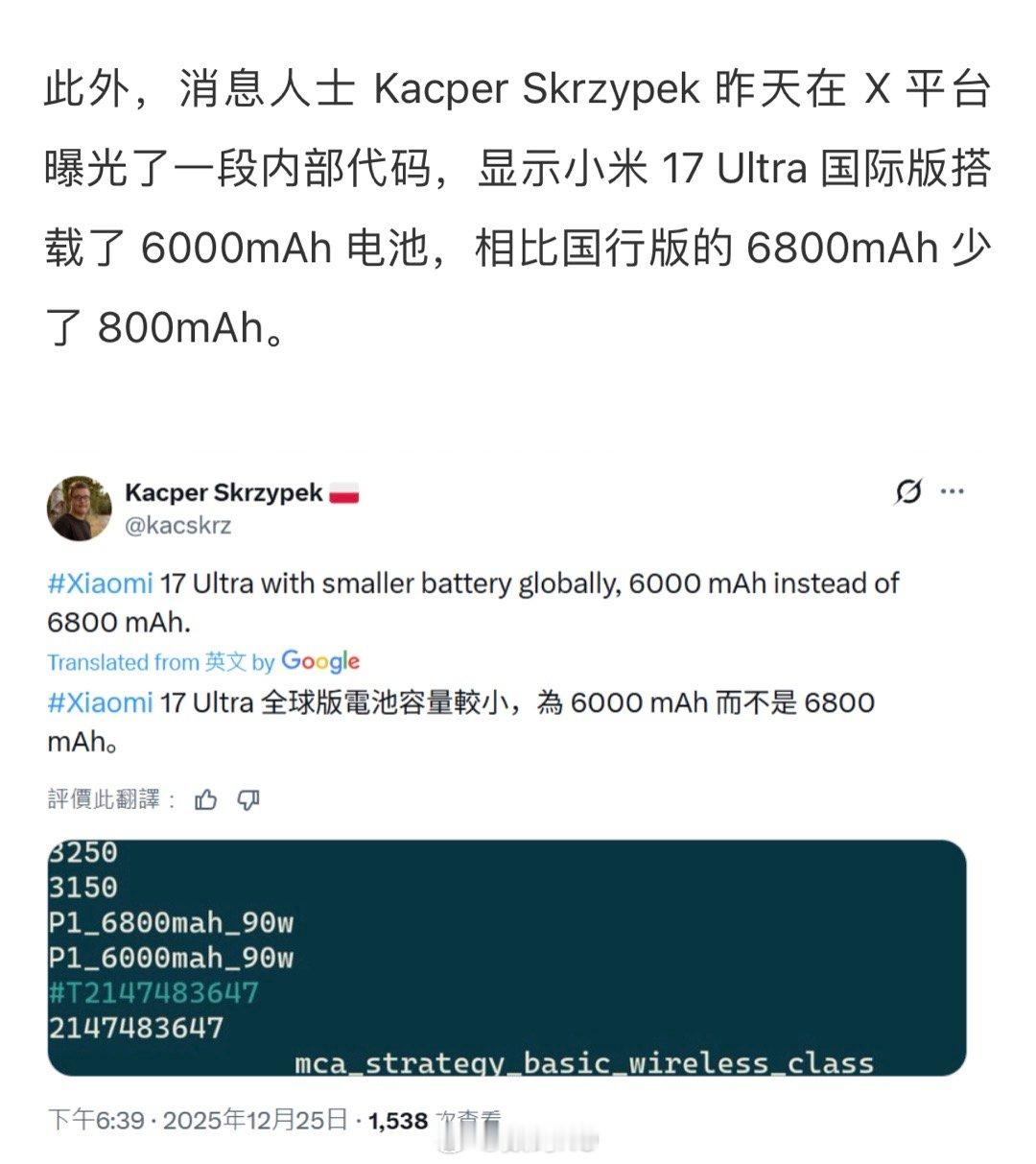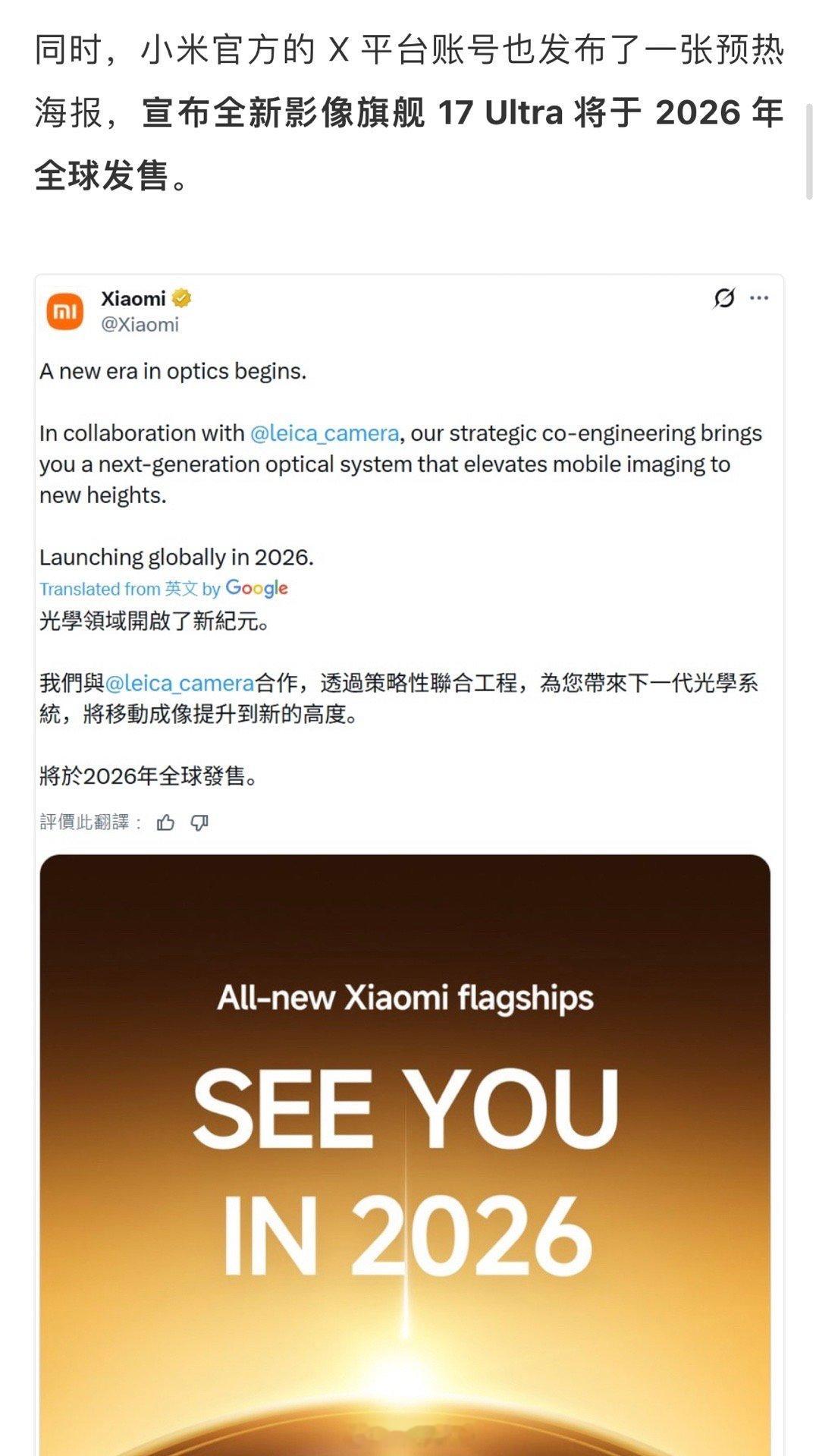 期待一手国外小米17Ultra的价格,电池还给减少了