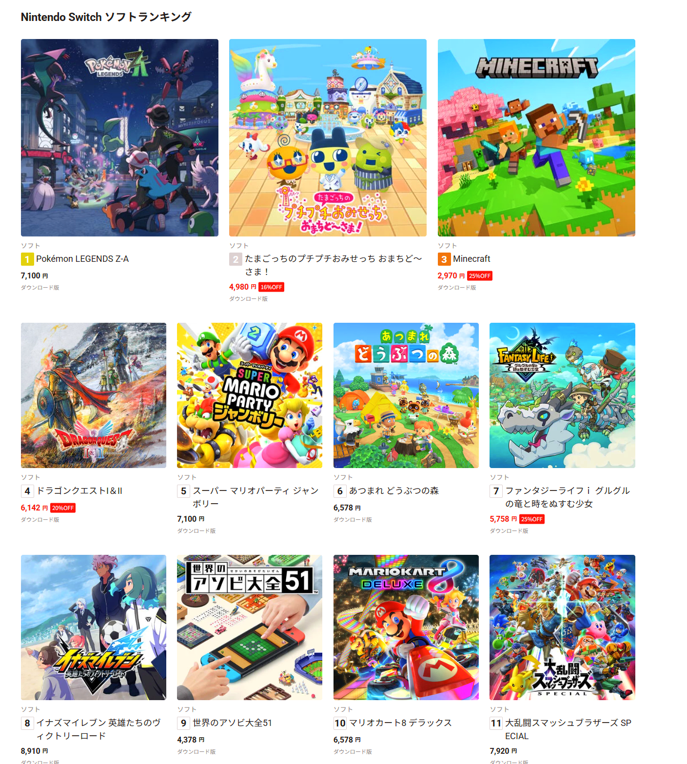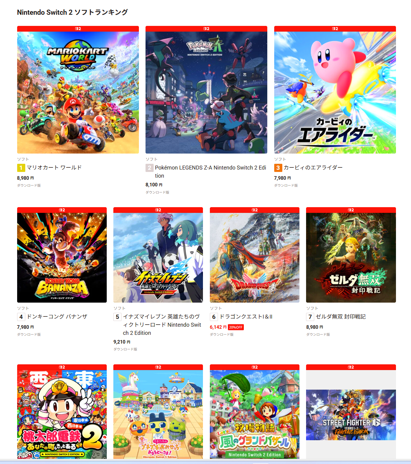 【任天堂公布年度下载榜!Switch/Switch2热销TOP20】任天堂日服今日发布2025年度下载榜top20,2025年(2025年1月1日~12月21日)在任天堂eShop、My Nintendo Store下载的Switch 2、Switch游戏的TOP20排行榜。Switch 2游戏下载榜:1.《马力欧卡丁车:世界》2.《宝可梦传说 Z-A Switch 2版》3.《卡比的驭天飞行者》4.《咚奇刚 蕉力全开》5.《闪电十一人 英雄们的胜利之路 Switch 2版》6.《勇者斗恶龙 I&II HD-2D重制版》7.《塞尔达无双 封印战记》8.《桃太郎电铁2 ~你的城镇也一定有~Switch 2版》9.《欢迎光临!拓麻歌子开心镇 Switch 2版》10.《牧场物语:来吧!风之繁华集市 Switch 2版》11.《街头霸王6:第1-2年战士版》12.《符文工厂 龙之天地 Switch 2版》13.《Nintendo Switch 2秘密展》14.《歧路旅人0》15.《闪耀路标:成为你的偶像!》16.《人中之龙0 誓约之地 导演剪辑版》17.《最终幻想战略版:伊瓦利斯战记 Switch 2版》18.《超级马力欧派对 空前盛会Nintendo Switch 2 Edition + 空前盛会TV》19.《空洞骑士:丝之歌 Switch 2版》20.《幻想生活i:转圈圈龙和偷取时间的少女》Switch游戏下载榜:1.《宝可梦传说 Z-A》2.《欢迎光临!拓麻歌子开心镇》》3.《我的世界》4.《勇者斗恶龙I&II HD-2D重制版》5.《超级马力欧派对 空前盛会》6.《集合啦!动物森友会》7.《幻想生活i:转圈圈龙和偷取时间的少女》8.《闪电十一人 英雄们的胜利之路》9.《世界游戏大全51》10.《马力欧卡丁车8 豪华版》11.《任天堂明星大乱斗 特别版》12.《实况力量棒球2024-2025》13.《都市传说解体中心》14.《勇者斗恶龙3重制版》15.《桃太郎电铁2 ~你的城镇也一定有~ 东日本篇+西日本篇》16.《牧场物语:来吧!风之繁华集市 》17.《超级机器人大战Y 数字终极版》18.《有氧拳击3 -你的私人教练-》19.《超级马力欧银河1+2》20.《斯普拉遁3》