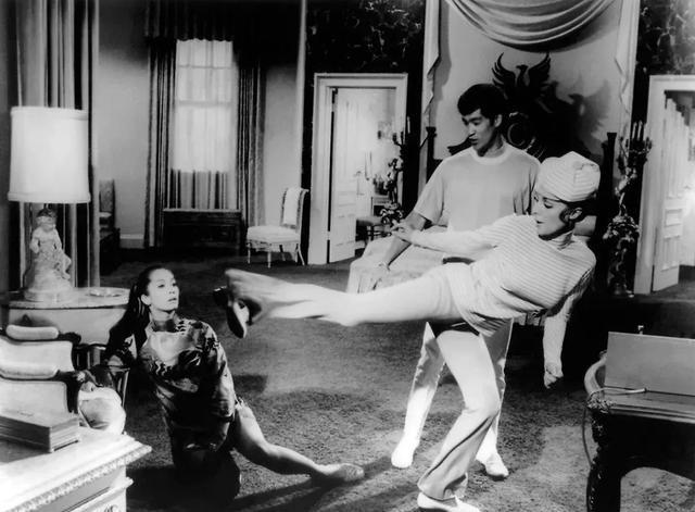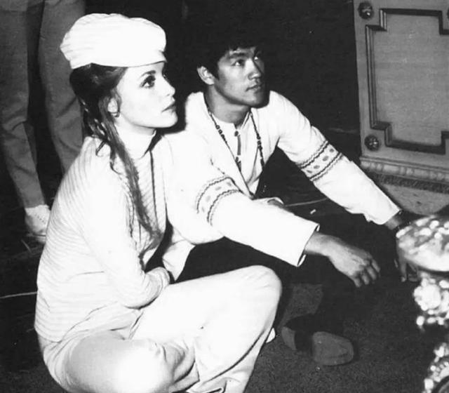 1968年,美女明星莎伦·塔特向李小龙学习功夫,李小龙戴着眼镜认真传授。一年之后