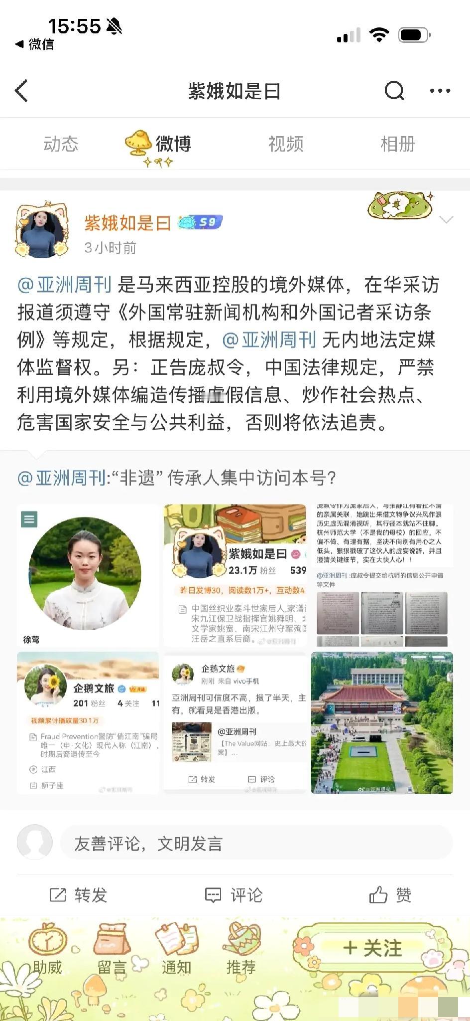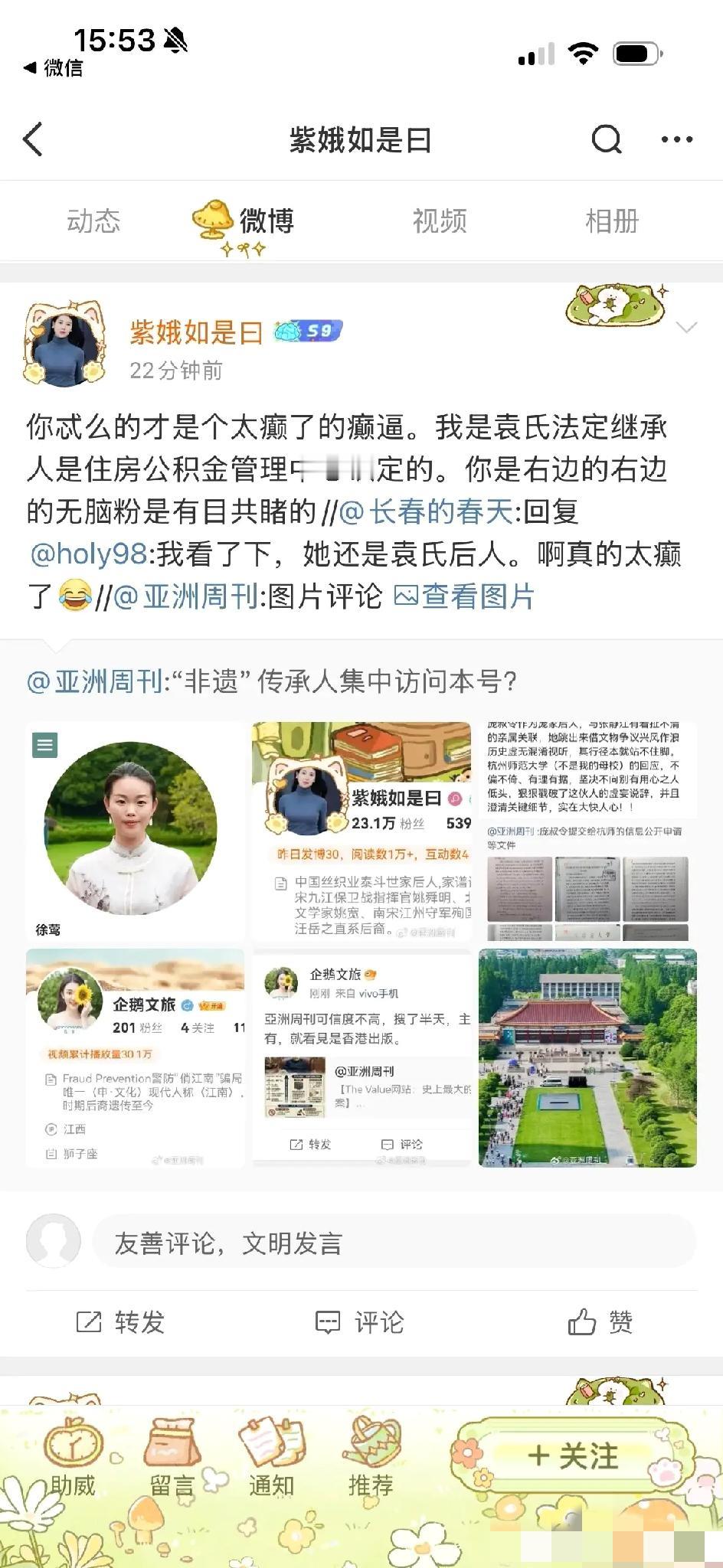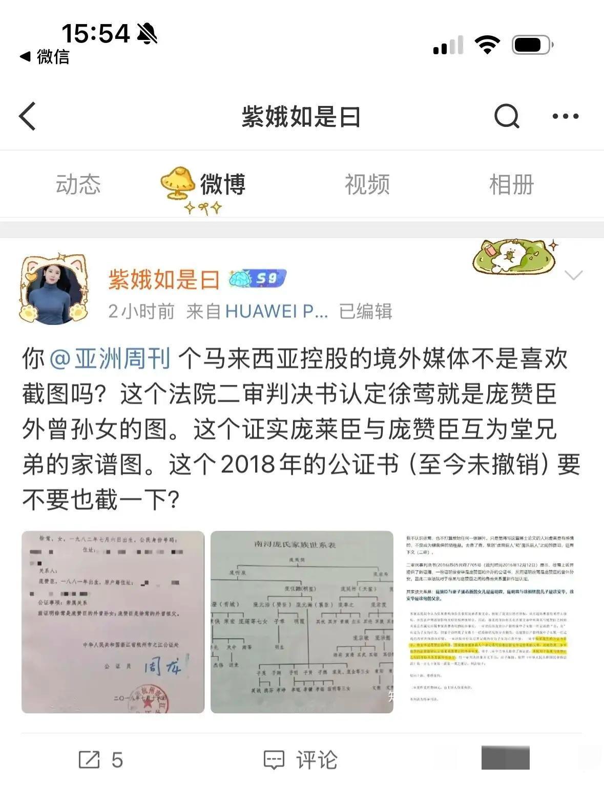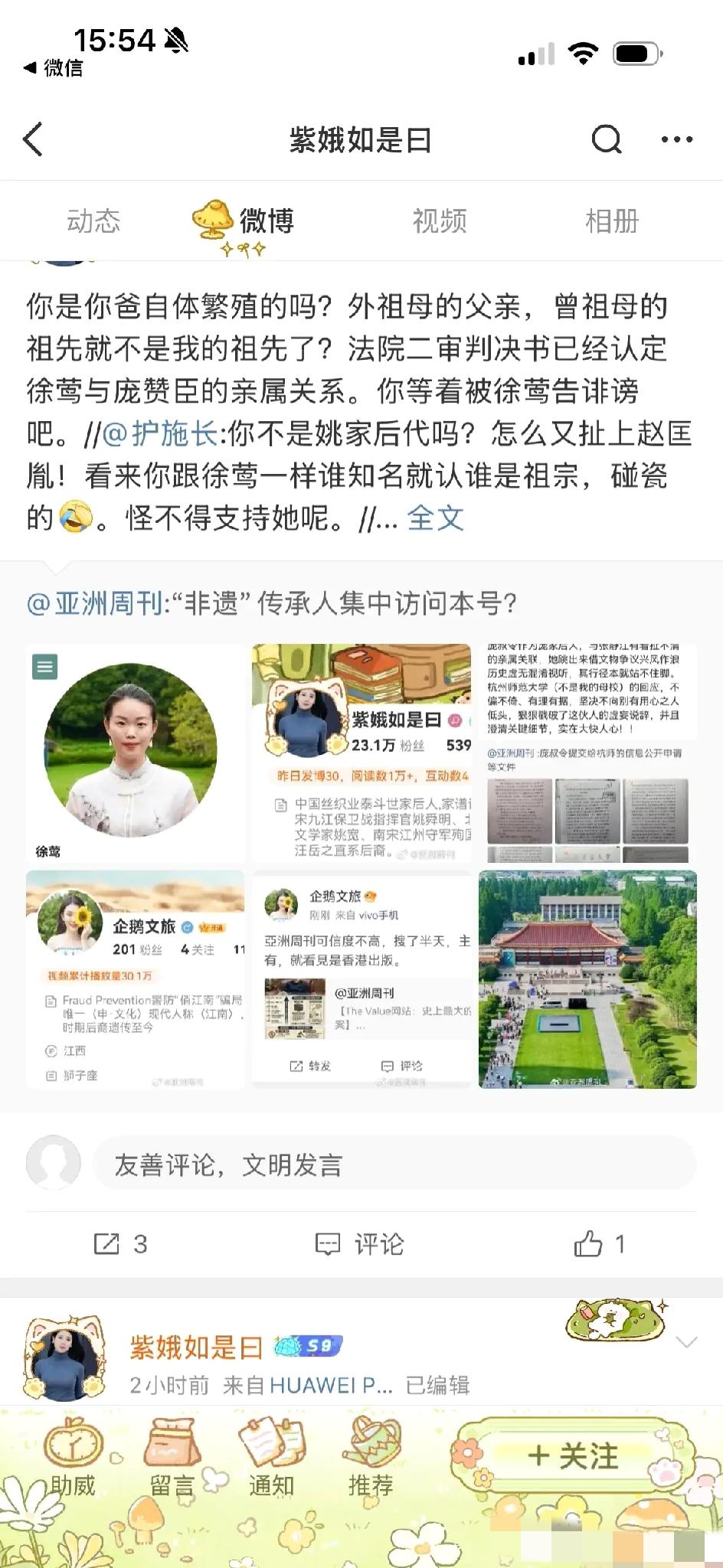徐莺彻底破防了, 从昨天晚上到现在,徐莺连发近百条微博,与亚洲周刊和网友互怼, 并且各种脏话不断,书香世家的嘴脸被彻底撕碎了。 这一回,徐莺是真的是口无遮拦了,和网友们互怼,说不过就开始爆粗口,这样的画面也太难看了,要知道好歹还是一个博士生,一个师范副教授,就这样的素养简直令人大跌眼镜。 而且她主攻的对象是亚洲周刊,说亚洲周刊发布的内容不可信,不是内地媒体,是一个在境外马来西亚注册的外媒而已,当不得真。 还有一个最引人注目的是她还在坚持自己的庞家身份,表示法院二审判决书认定她徐莺就是庞赞臣的外曾孙女,看来这个庞家身份她是真的要坚持到底了。 可就算是庞赞臣的后人也不是直系,是一个外曾孙女,和庞莱臣更是不搭边了,庞虚斋才是收藏界的权威认证,坚持这个身份还不是因为想蹭“虚斋”的名头。 再一个就是徐莺拿庞叔令和张静江疑似有亲属关系作文章,看来她已经是气急败坏了,单凭几句毫无根据的言语,网友可不会轻信。