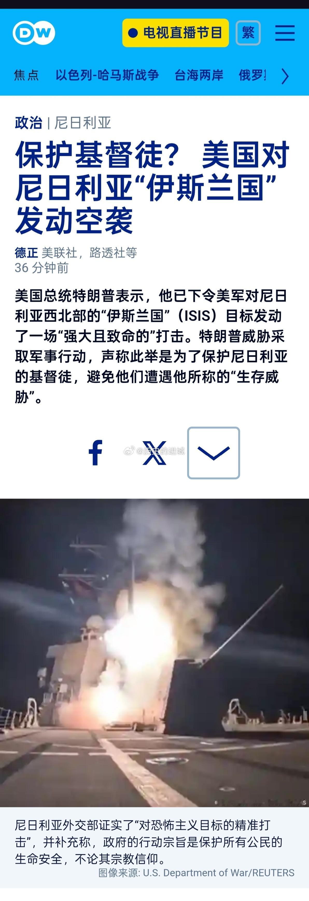 美国总统特朗普表示,他已下令美军对尼日利亚西北部的“伊斯兰国”(ISIS)目标发动了一场“强大且致命的”打击。特朗普威胁采取军事行动,声称此举是为了保护尼日利亚的基督徒,避免他们遭遇他所称的“生存威胁”。