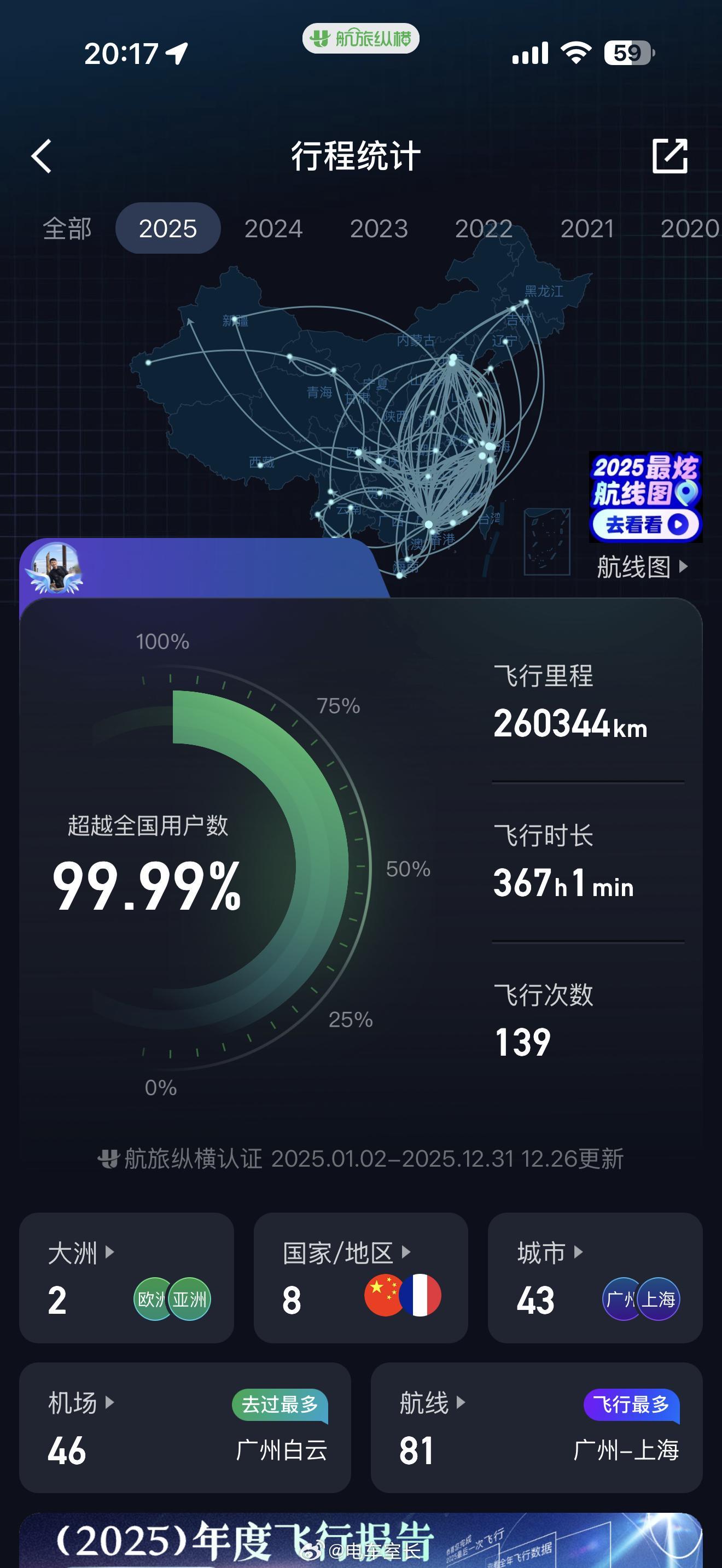航旅纵横这个年度飞行总结说我今年飞行0次,这个……今年我应该会飞到143次以上啊