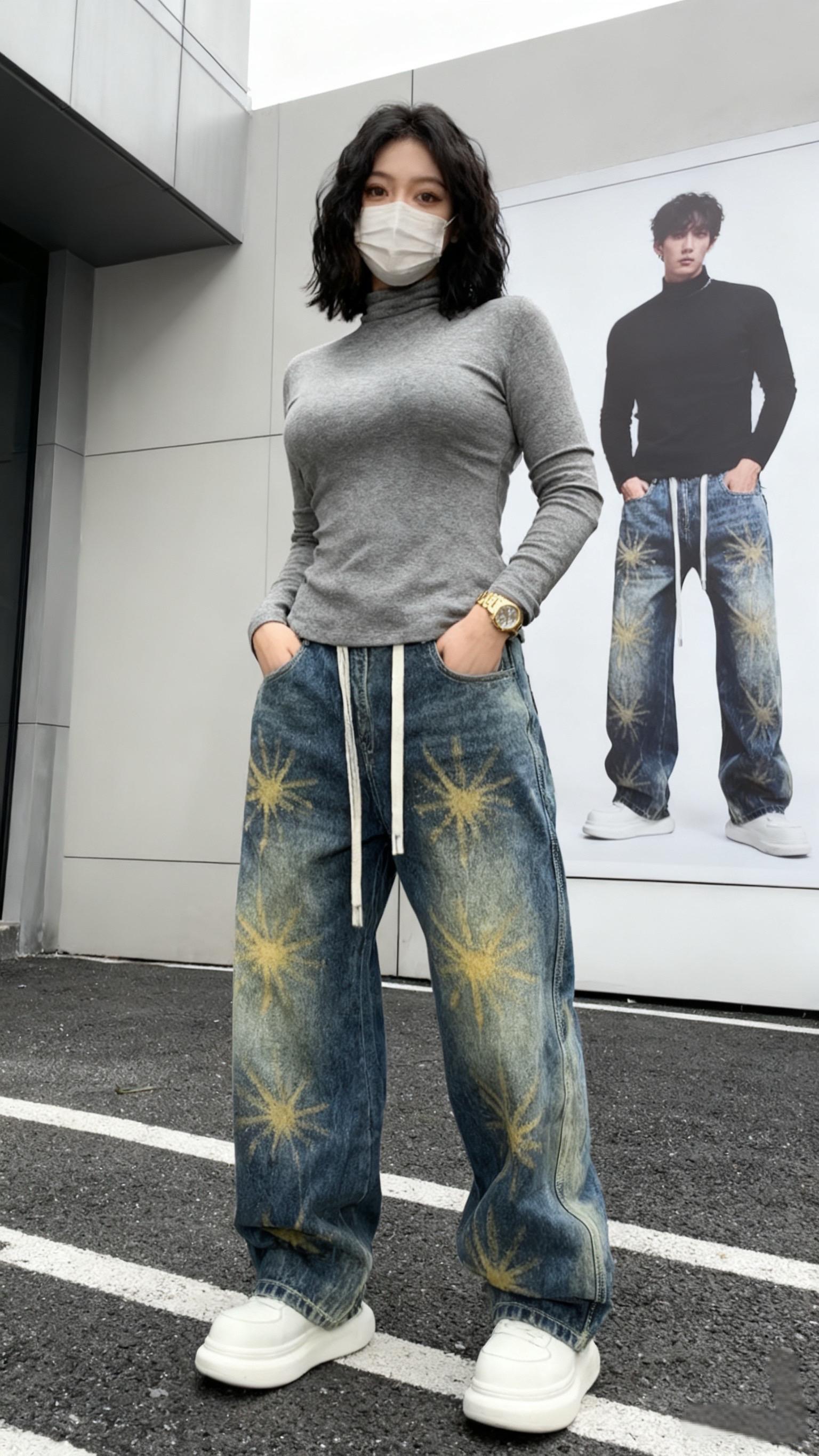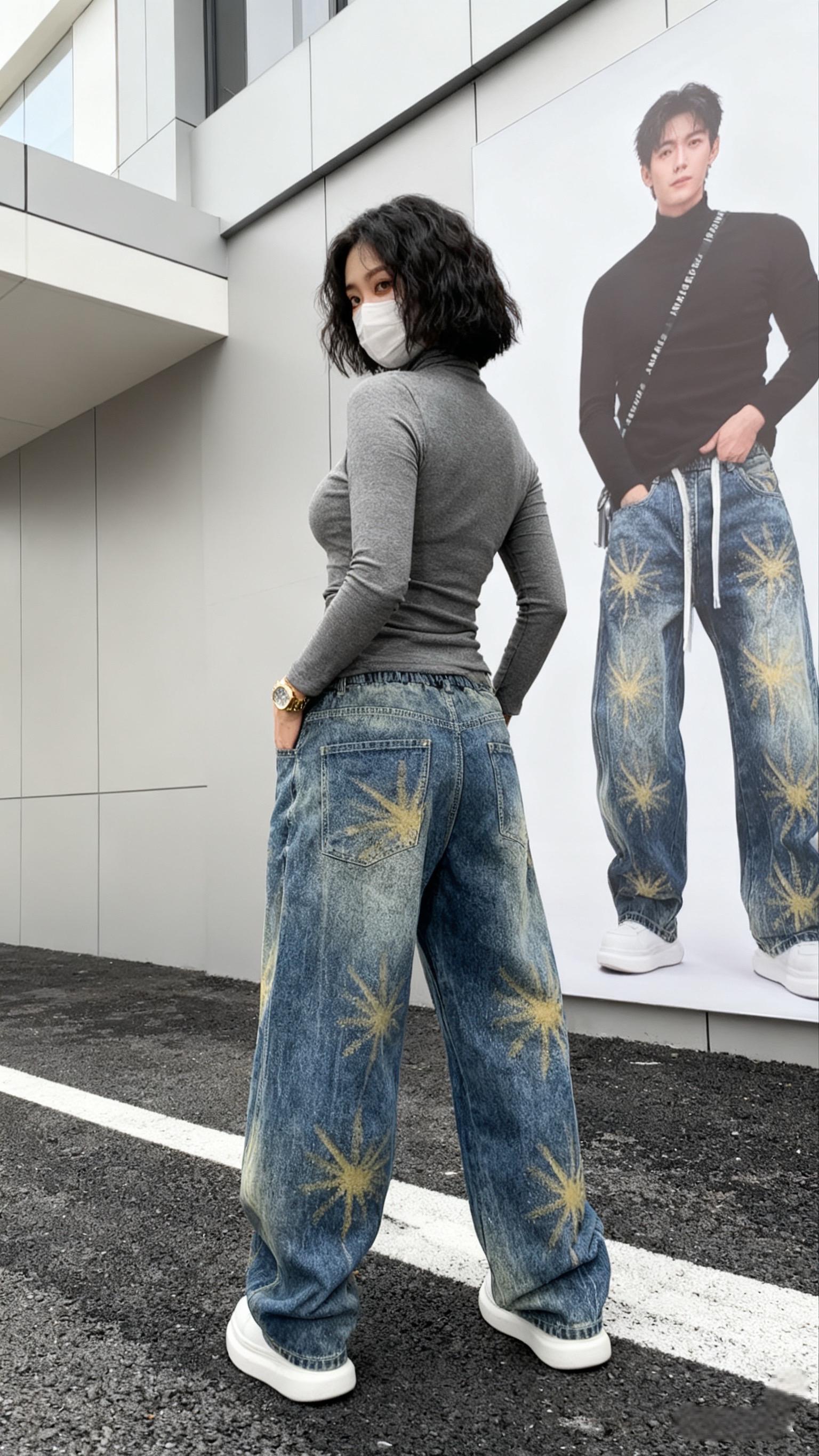 冬季新款设计感水洗牛仔裤个性手绘直筒裤潮流宽松松紧嘻哈风长裤