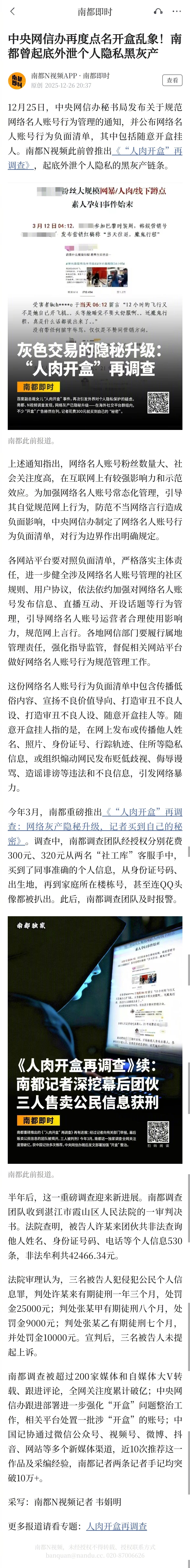 #网络名人账号有了明确行为边界#【中央网信办再度点名开盒乱象!南都曾起底外泄个人
