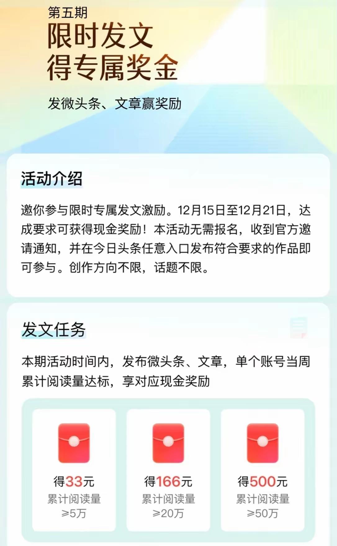 又一次收到头条的大奖金了!12月16日收到微头条小秘书的邀请通知,参加12月15日至21日第五期的限时发文激励活动,这些微头条活动发文技巧,那可是实打实的“流量密码”,亲测有效不掺水! 紧扣活动主题是基本操作,关键词往标题和开头猛贴,别搞天马行空的跑偏内容,不然系统都不知道咋给你推流。别纠结写长篇小作文,挑自己最熟的领域咔咔输出,碎片化的观点反而更吃香。 踩准早7-9点、午12-13点、晚19-22点这几个黄金时段发,用户刷得勤,曝光率直接翻倍。发文后1小时内盯紧评论区,读者问啥都积极回,互动率上去了,流量池等级才会蹭蹭涨。 最后记得把格式整利索,短句分段、关键信息加粗,再带上活动话题标签,读着舒服,系统也爱推!
