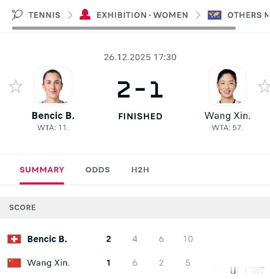表演赛:王欣瑜不敌本西奇 在一场澳网之前的表演赛中,世界排名第57的王欣瑜与世界排名第11的瑞士🇨🇭选手本西奇进行了一场表演赛,王欣瑜先以6-4赢得头筹,第二盘以2-6输给本西奇,在决胜盘的抢十中,王欣瑜5~10负于本西奇。