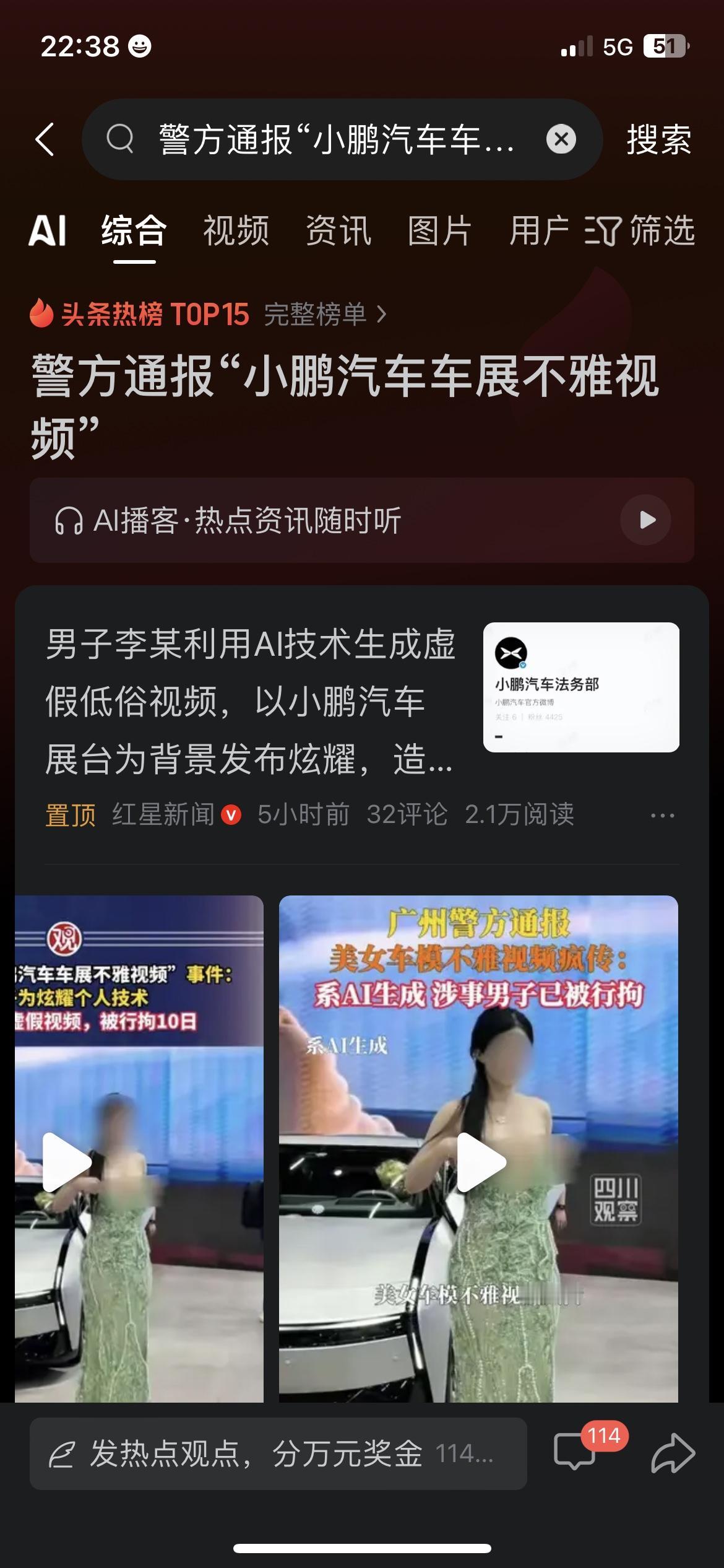男子AI造小鹏车展低俗假视频,直接刑拘10日太解气 这两天刷到个离谱事必须跟大家说说!11月底就有小鹏车展AI低俗假视频流传,小鹏当天就报警维权,警方调查后查出是36岁男子李某干的,他为炫耀技术用AI伪造视频发网上,造成不良影响,12月10日已被依法行政拘留10日。现在AI造假越来越容易,咱普通人刷视频真得仔细分辨真假,别被假内容误导,更不能跟风发不明来源的视频,造谣传谣不仅缺德,还得承担法律责任,真没必要因一时糊涂惹麻烦。 你刷到过难辨真假的AI视频吗?说说你咋区分的?ai编造谣言 小鹏人形