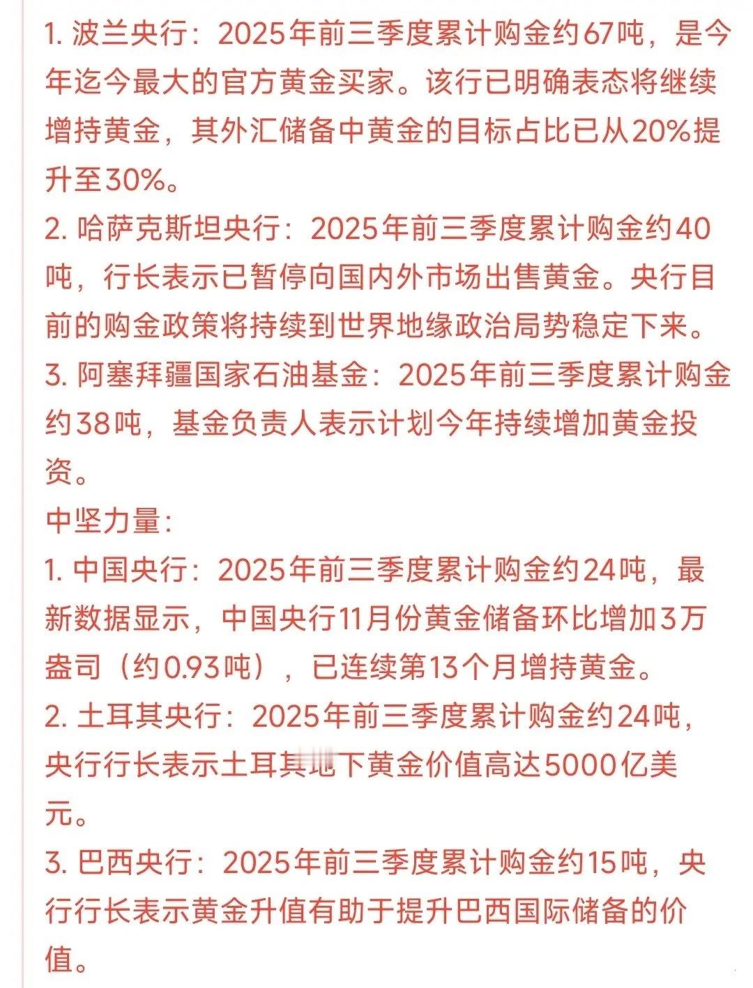 中国前三季度增持黄金24吨黄金仅仅只能排第三,前两位令人意外中国前三季度一直在增持黄金储备,已经增持了24吨,处于第三的位置。第一:波兰,是不是很意外,作为欧洲的国家,居然开始增加黄金。主要原因就是俄乌冲突刺激了波兰,直接增持黄金来抗风险第二:哈萨克斯坦,这个就更意外了,作为一个封闭性最高的国家,哈萨克斯坦在大量储金,主要是国内产金,低成本。以换取大量得外汇抗风险。土耳其也在储金,作为中东老牌强国储金并不意外。巴西是跟着抄作业,不过目前黄金在疯狂增长的情况下,储金是最正确的选择。