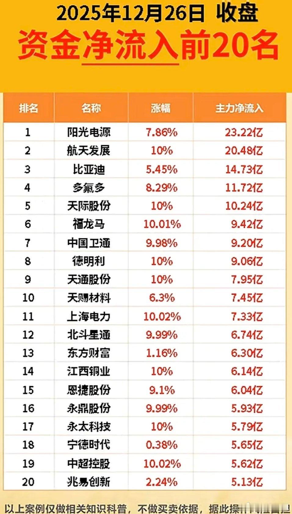 12月26日收盘资金净流入前20股梳理分析!今日资金主力集中于新能源、军工、半导体、电力、有色金属等赛道;超七成个股涨幅达9%以上(含涨停),阳光电源icon主力净流入以23.22亿居首,宁德时代icon虽涨幅仅0.38%,仍跻身净流入榜单,反映资金既追捧高景气赛道涨停股,也布局行业核心龙头。个股梳理分析1. 阳光电源:主力净流入23.22亿居首,涨幅7.86%,作为光伏逆变器龙头,未涨停却获资金重点布局,体现市场对光伏赛道的看好,是新能源板块核心标的之一。2. 航天发展:涨停(10%),主力净流入20.48亿排第二,属军工板块,资金追捧或因军工政策利好/行业景气度提升,成为军工板块资金龙头。3. 比亚迪icon:涨幅5.45%,主力净流入14.73亿,新能源汽车龙头,虽涨幅不及涨停股,却凭行业地位获资金持续关注,反映新能源车赛道的长期吸引力。4. 多氟多icon:涨幅8.29%,主力净流入11.72亿,主营氟化工与锂电池材料,资金流入关联新能源材料需求增长,其电解液icon上游布局获资金认可。5. 天际股份icon:涨停(10%),主力净流入10.24亿,涉及锂电池电解液添加剂业务,是新能源材料细分标的,资金追捧推动涨停,凸显细分领域热度。6. 福龙马icon:涨幅10.01%近乎涨停,主力净流入9.42亿,主营环卫装备及服务,资金流入与环保、新能源环卫车发展预期相关,成环保板块资金焦点。7. 中国卫通icon:涨幅9.98%近乎涨停,主力净流入9.20亿,为卫星通信核心标的,低轨卫星、卫星互联网发展预期推动资金涌入,是通信航天热门股。8. 德明利icon:涨停(10%),主力净流入9.06亿,主营存储芯片icon相关业务,属半导体存储细分标的,资金追捧助力涨停,反映半导体板块局部热度。9. 天通股份icon:涨停(10%),主力净流入7.95亿,涉磁性材料、半导体设备领域,多元化布局契合高端制造方向,资金流入推动涨停获市场认可。10. 天赐材料icon:涨幅6.3%,主力净流入7.45亿,是锂电池电解液龙头,虽涨幅未达涨停,仍获主力持续布局,体现新能源电池材料赛道的价值。11. 上海电力icon:涨幅10.02%涨停,主力净流入7.33亿,属电力板块,绿电、新能源发电发展预期推动资金流入,是电力板块资金龙头之一。12. 北斗星通icon:涨幅9.99%近乎涨停,主力净流入6.74亿,为北斗导航核心标的,卫星导航产业发展与应用落地预期,吸引资金追捧成军工通信热门股。13. 东方财富icon:涨幅1.16%,主力净流入6.30亿,是证券互联网金融icon龙头,虽涨幅低迷,资金流入或源于金融板块配置需求,体现权重标的配置价值。14. 江西铜业icon:涨停(10%),主力净流入6.14亿,为有色金属龙头,铜价走势与新能源铜需求增长推动资金涌入,成有色板块资金焦点。15. 恩捷股份icon:涨幅9.1%,主力净流入6.04亿,是锂电池隔膜龙头,新能源电池材料高景气下获资金关注,虽未涨停仍受主力青睐。16. 永鼎股份icon:涨幅9.99%近乎涨停,主力净流入5.93亿,涉光通信、超导领域,多元化科技赛道布局吸引资金,推动其接近涨停。17. 永太科技icon:涨停(10%),主力净流入5.79亿,主营氟化工及锂电材料,是新能源材料细分标的,资金追捧助力涨停,彰显细分领域机会。18. 宁德时代:涨幅0.38%,主力净流入5.65亿,为锂电池龙头,虽当日涨幅微弱,却凭绝对行业地位获主力布局,体现长期配置价值。19. 中超控股icon:涨幅10.02%涨停,主力净流入5.62亿,涉电线电缆、新能源线缆业务,属新能源配套标的,资金流入推动涨停获市场关注。20. 兆易创新icon:涨幅2.24%,主力净流入5.13亿,是半导体存储龙头,虽涨幅较低,半导体国产替代的长期逻辑仍吸引主力资金布局。总结今日资金净流入前20股展现出明显的赛道偏好,新能源(光伏、锂电)、军工、半导体为资金主攻方向,高景气赛道的细分龙头与行业核心标的均获追捧;部分权重股虽涨幅低迷,仍获资金布局,反映市场兼具短期热点炒作与长期核心资产配置的双重思路,赛道轮动与细分领域机会成为资金布局的关键逻辑。