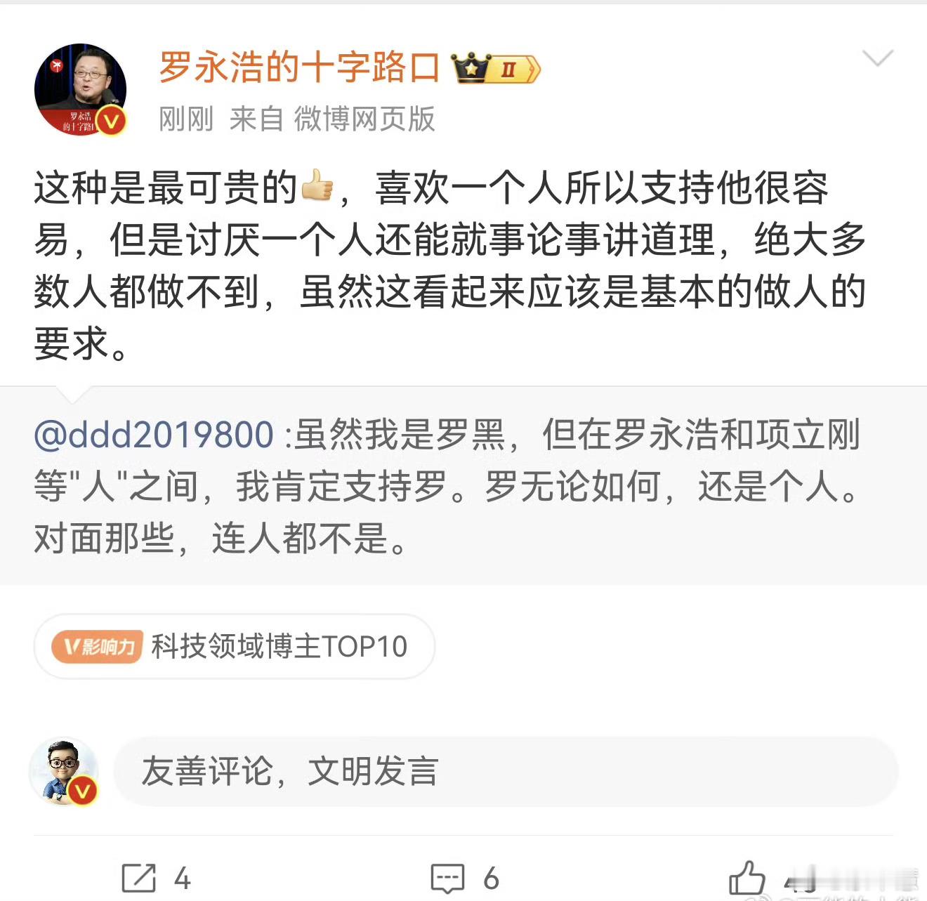 罗永浩转发这个留言说得有点狠!不能如此吐槽项立刚吧?最少目前这场争论还是摆事实讲道理的!