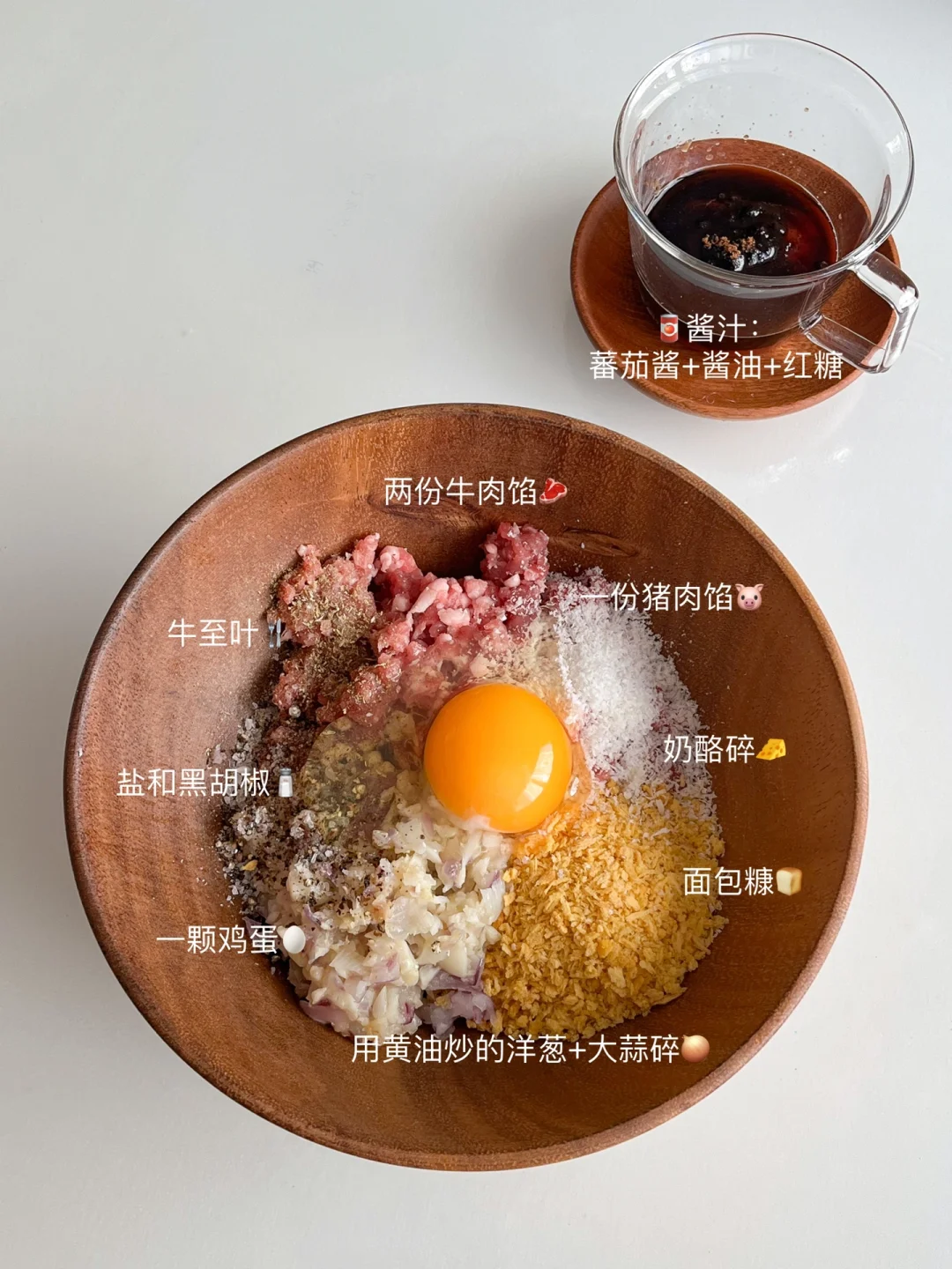 猪肉一份 牛肉两份 面包糠 奶酪碎 鸡蛋 调味料