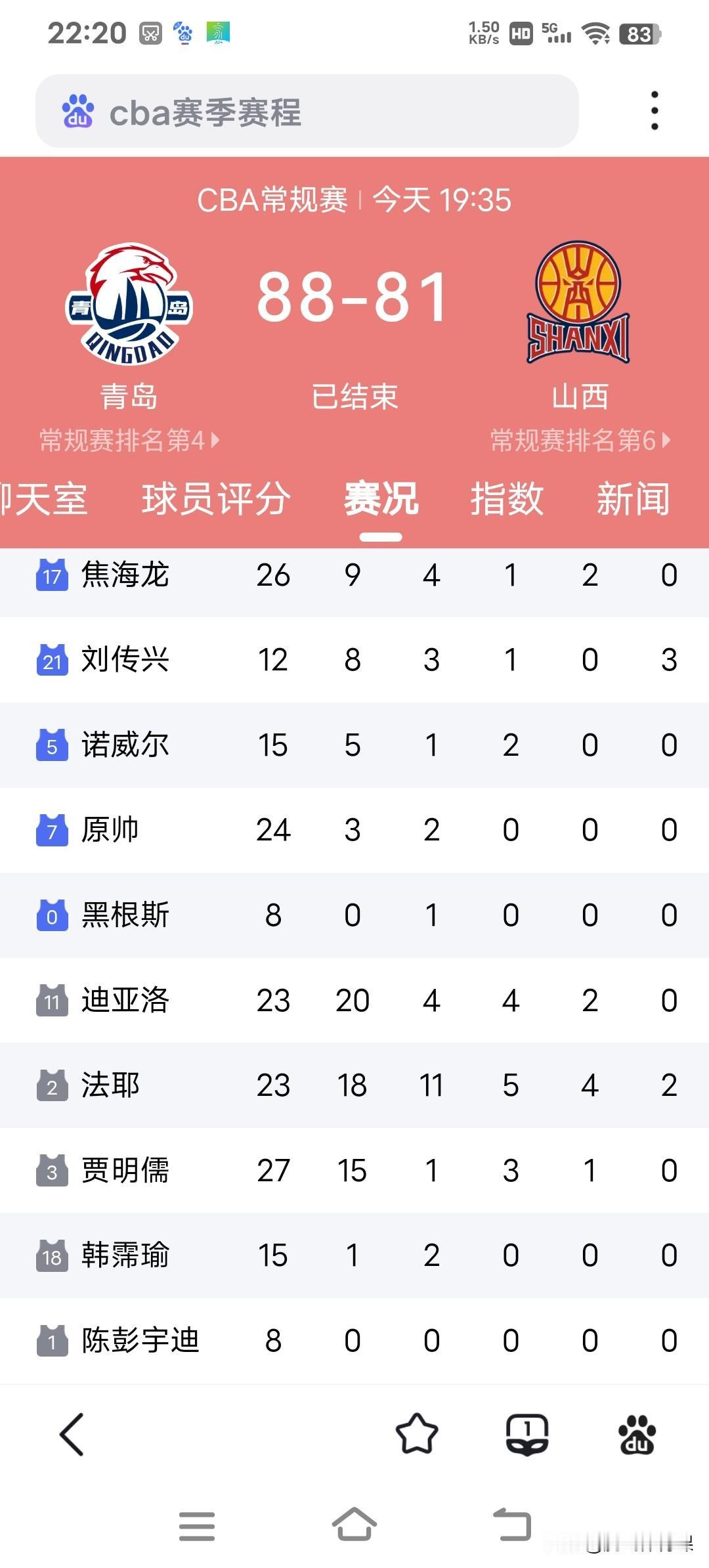 手感冰凉!山西客场81:88不敌青岛,看数据统计谁最该背锅? 1.焦海龙--出战26分米,贡献9分4篮板1次助攻2次盖帽, 2.刘传兴--出战12分钟,贡献8分3篮板1次助攻, 3.诺威尔--出战15分钟,贡献5分1篮板2次助攻, 4.原帅--出战24分钟,仅贡献3分2篮板, 5.黑根斯--出战8分钟,0分1篮板0次助攻, 6.迪亚洛--出战23分,贡献20分4篮板4次助攻2次抢断, 7.法耶--出战23分钟,贡献18分11篮板5次助攻4次抢断, 8.贾明儒--出战27分钟,贡献15分1篮板3次1次抢断, 9.韩霈瑜--出战15分钟,仅贡献1分2篮板, 10.陈彭宇迪--出战8分钟,所有数据都是0. 11.于米提--出战12分钟,所有数据都是0. 本场比赛山西队有11人出场,其中黑根斯,于米提,陈彭宇迪一分未得,原帅作为球队的外线主公点仅有2次出手机会,张宁伤停,葛昭宝等着退休,三大顶薪球员就是摆设。