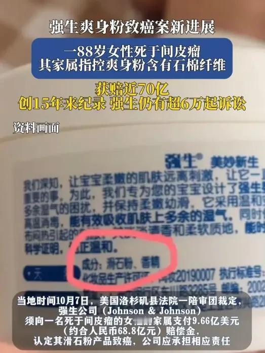 110亿!一名普通女子用生命撕开了强生爽身粉的安全谎言! 最近美国法院的判决刷屏了。因长期使用强生含石棉的婴儿爽身粉,一名女性患上间皮瘤,公司被判赔110亿元,创下15年来最高纪录!可强生一边上诉,一边全球停售滑石粉产品,这波操作网友直呼早干嘛去了? 别看强生嘴上喊着产品安全,却悄悄把配方换成玉米淀粉,淘宝旗舰店现在全标着不含石棉。但真相是滑石粉矿藏本就易混致癌石棉,世界卫生组织早把它列为2A类致癌物!更扎心的是,强生还有超6.7万起诉讼等着排队,此前试图用子公司破产躲债,直接被法官怼不诚信。 这哪只是赔钱?是千万消费者用健康给企业上的血泪课!当大品牌把利润置于人命之上,再猛的道歉也难赎罪。建议家长选购爽身粉时直接盯准玉米淀粉款,毕竟孩子的安全,赌不起啊!