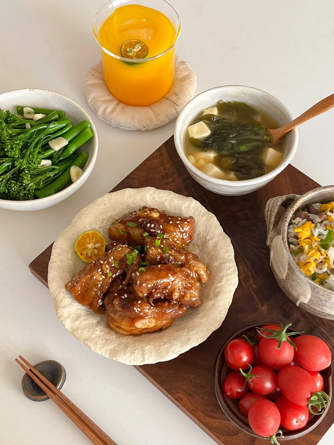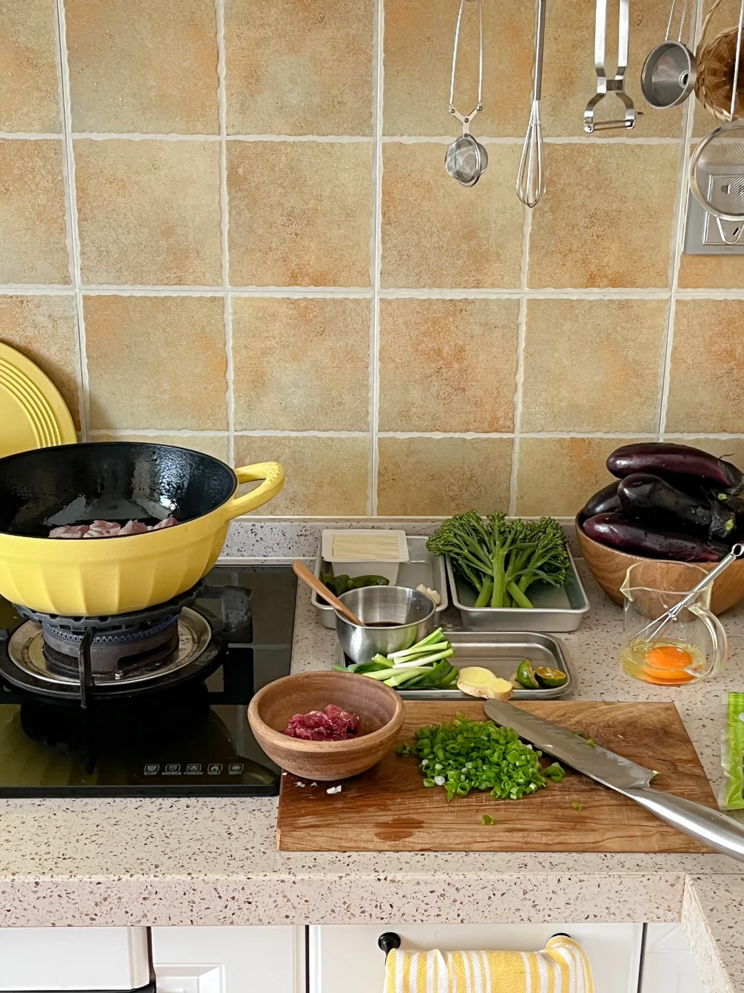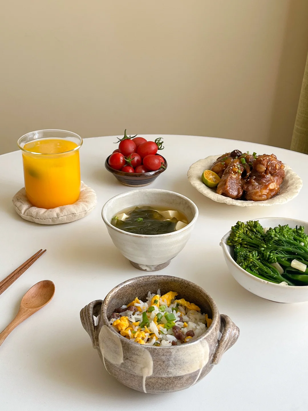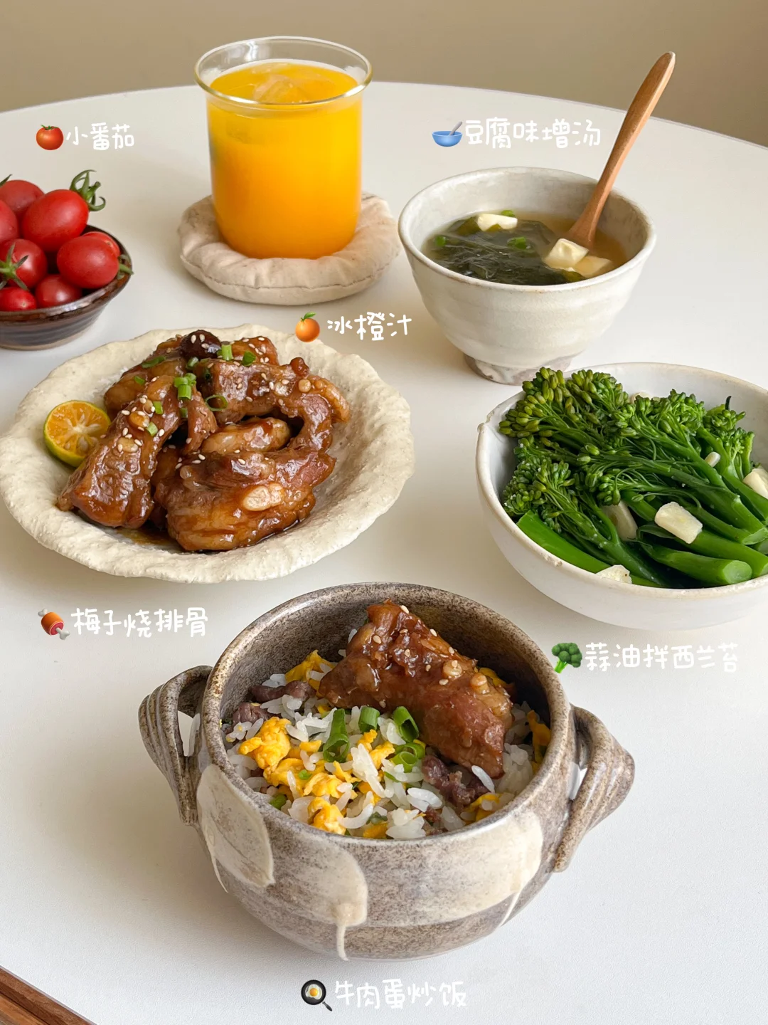 北方终于要入夏了🍃 早市遇到一元一斤的小茄子包儿 买💰2块钱儿 做了一盘蒜茄子 我最爱的夏天配粥搭子 今天的饭: 酸梅烧排骨🍖 蒜油凉拌西兰苔🥦 牛肉鸡蛋炒饭🍳 小番茄🍅 豆腐味增汤🍥 冰柑橘汁🍊