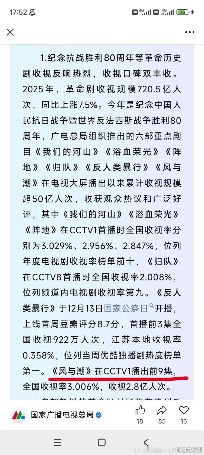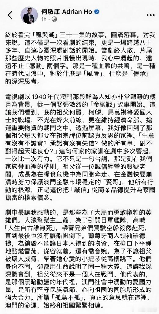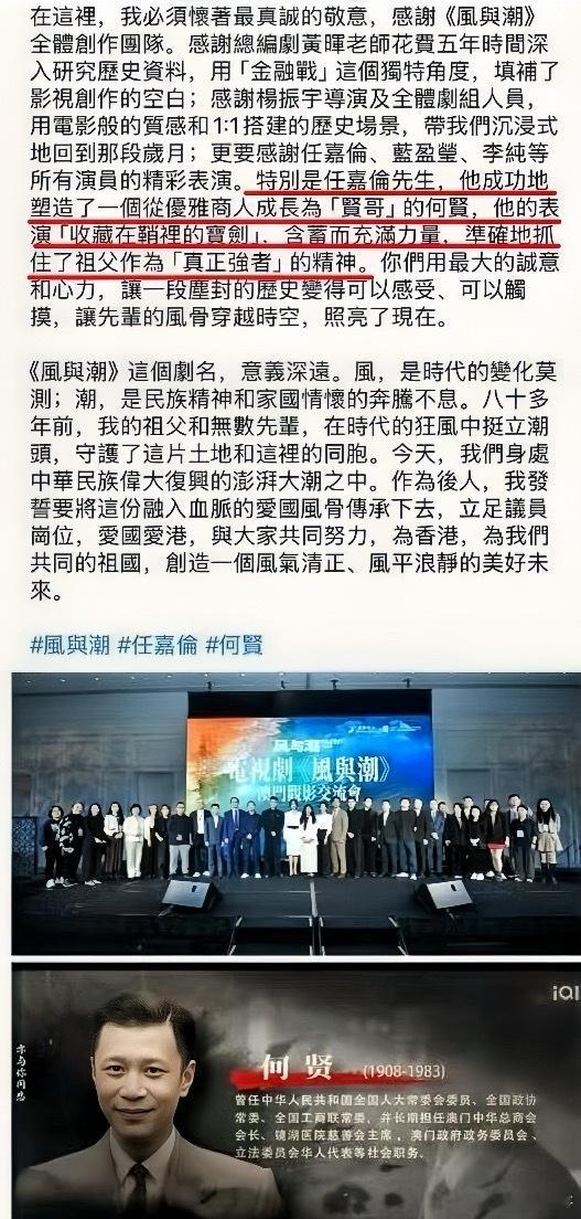 cvb2025年收视报告中专门提到任嘉伦今年三部上星剧—无忧渡、凤凰台上和风与潮,其中风与潮以前9集3.006%覆盖收视2.8亿人次且任嘉伦在风与潮中饰演的何贤一角被何贤先生后人单独提及,并称赞他的表演是[收藏在鞘里的宝剑]含蓄而充满力量,准确地抓住了祖父作为真正[强者]的精神!国超太棒了!