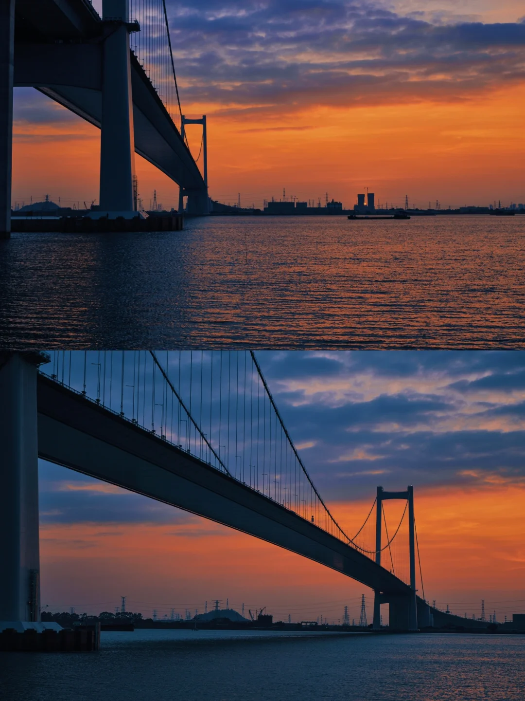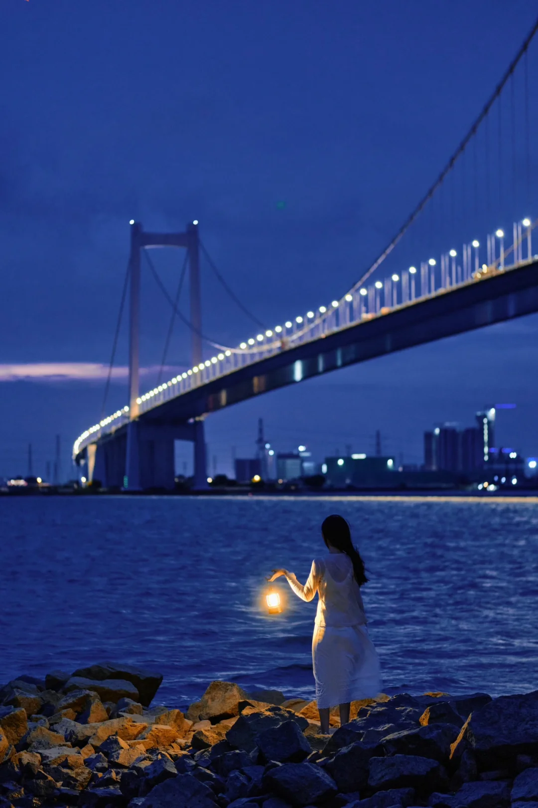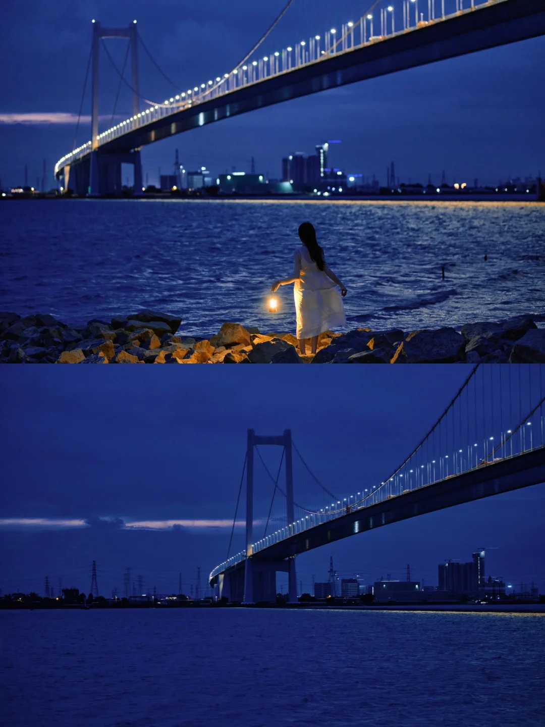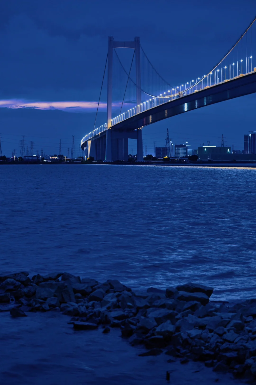 🌉🌉巨大的桥梁下,水面与天空颜色相照应,深邃的蓝色开始吞噬整个世界,这便是大自然无与伦比的滤镜,美丽而神秘
