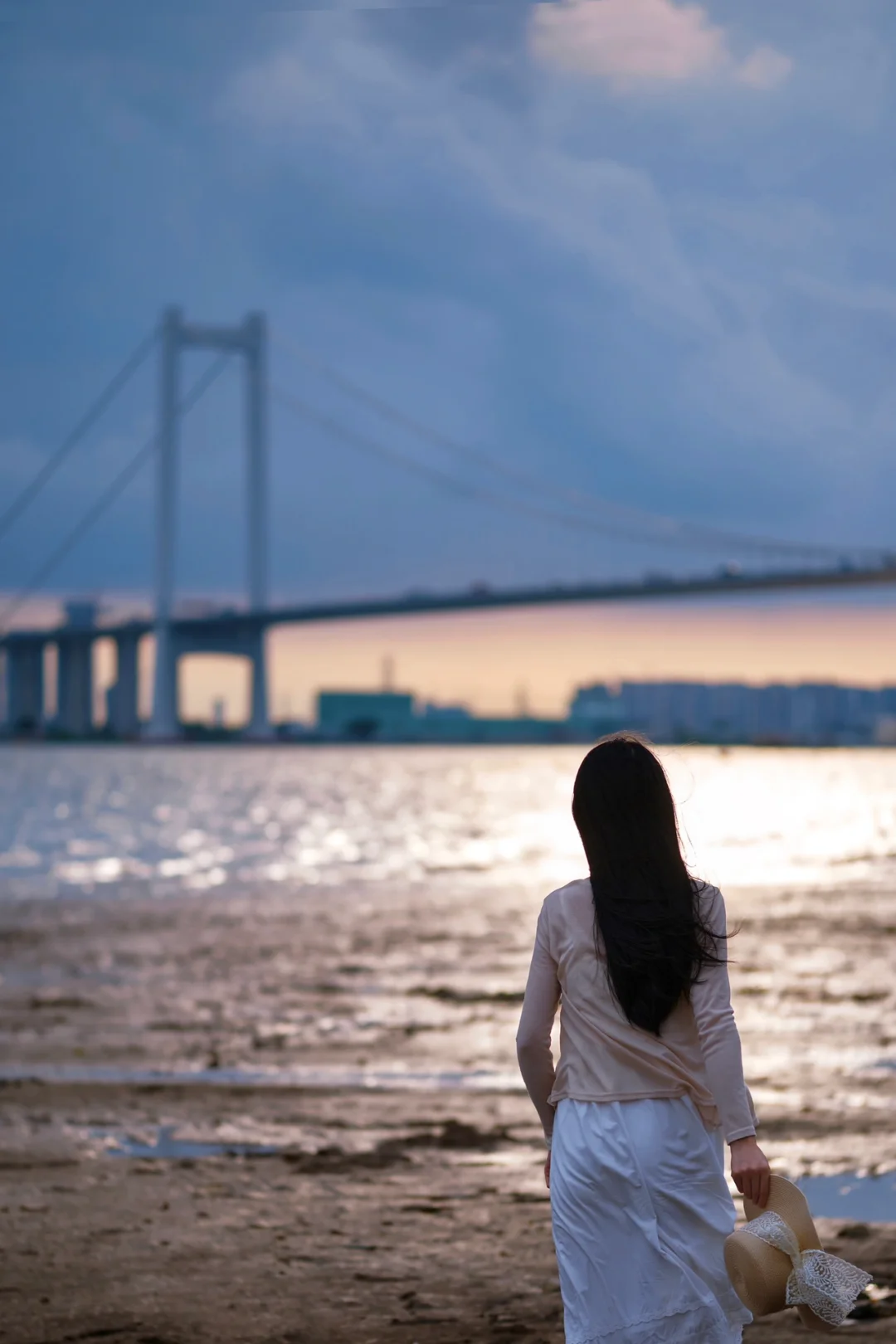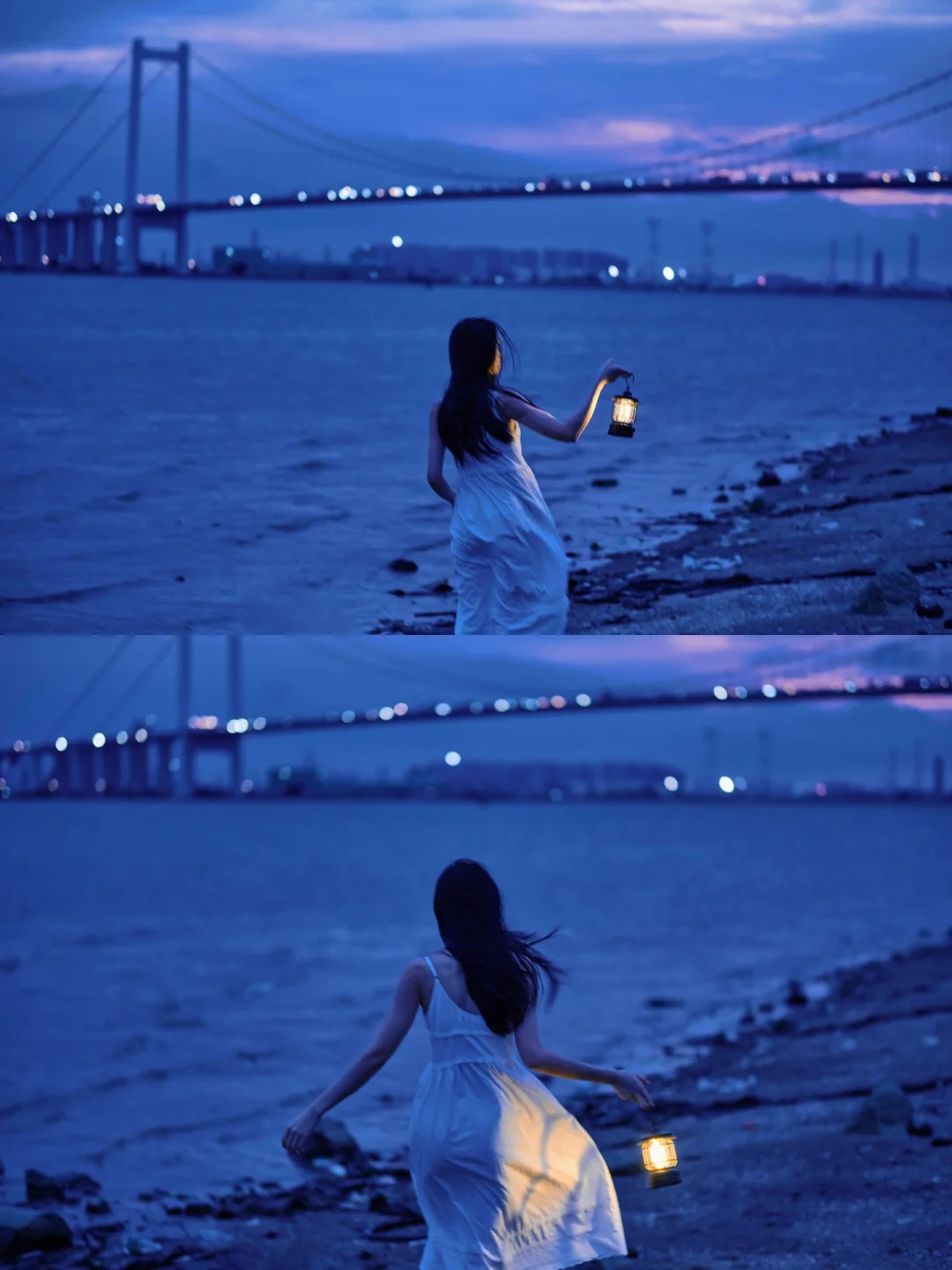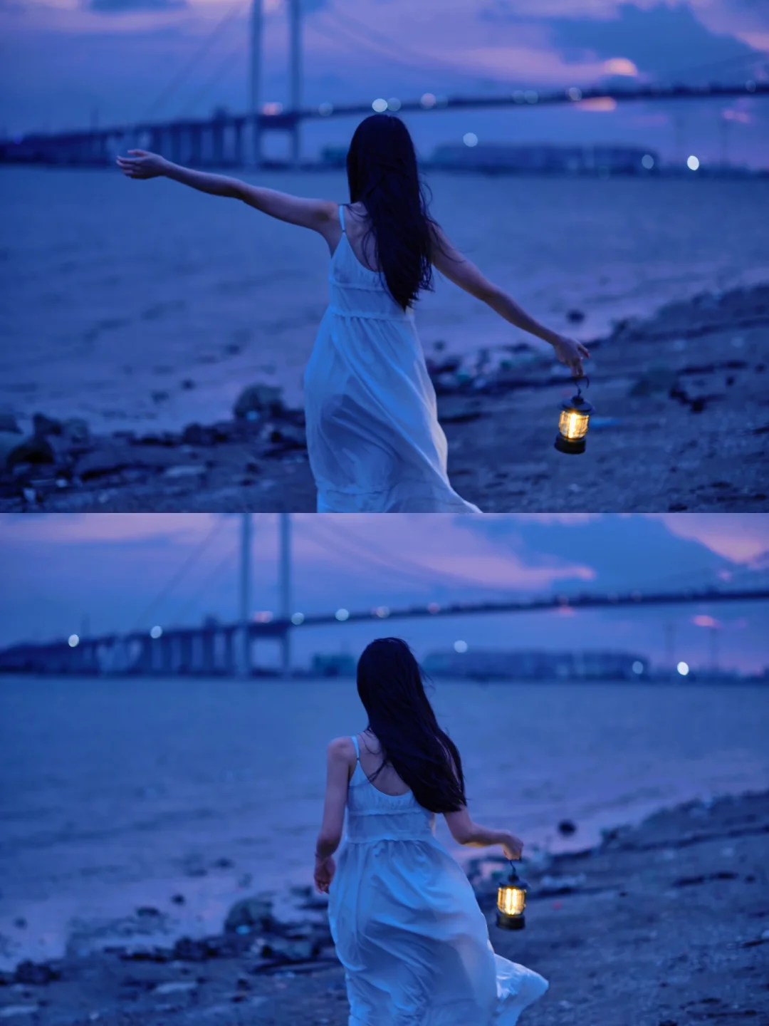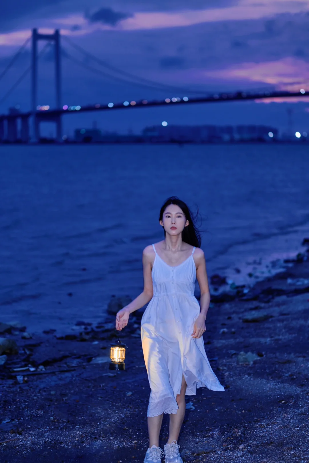 穿着白色吊带连衣裙👗漫步在岸边,身影在暮色中若隐若现。