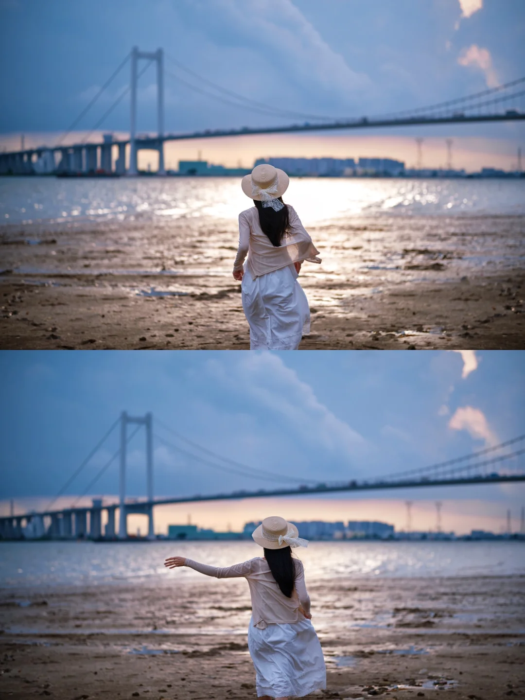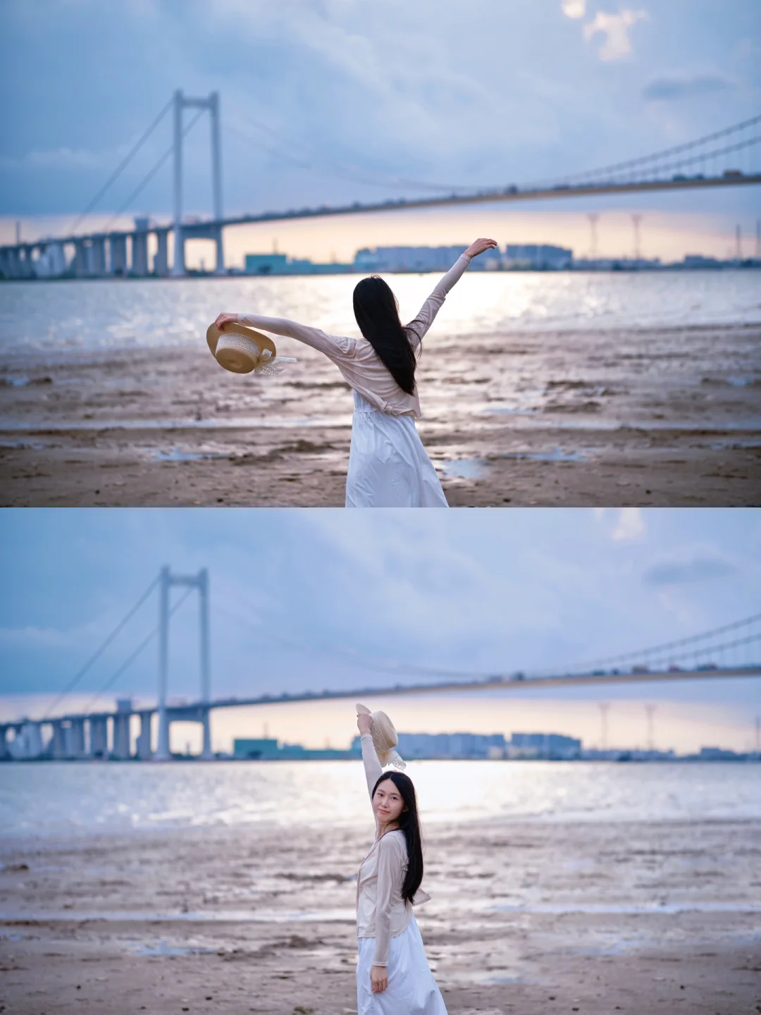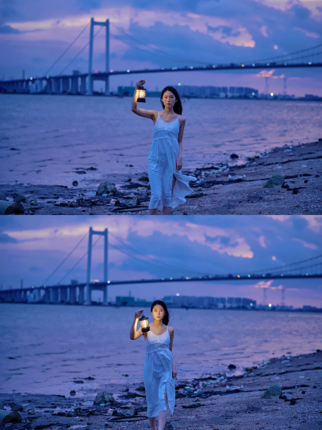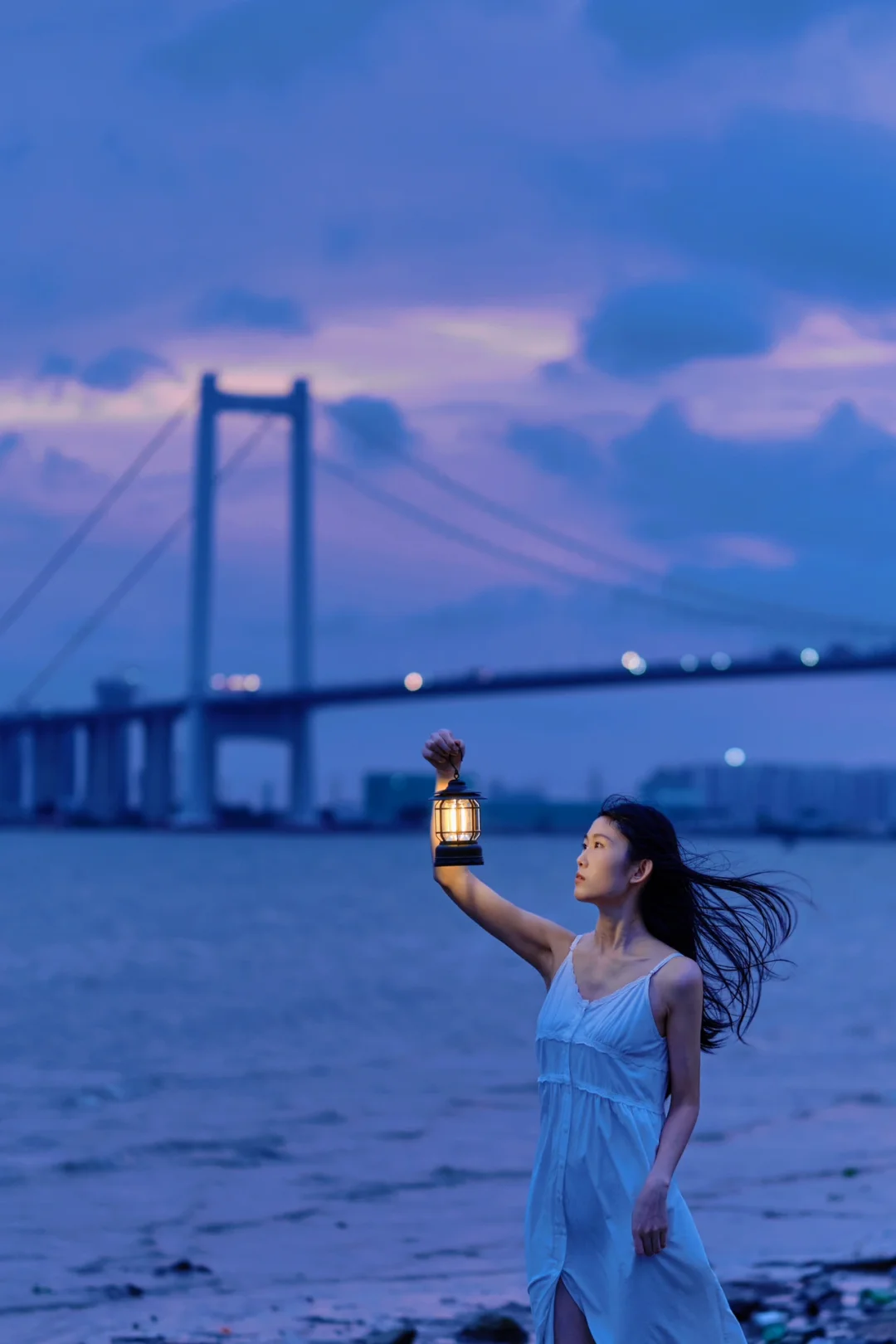 穿着白色吊带连衣裙👗漫步在岸边,身影在暮色中若隐若现。