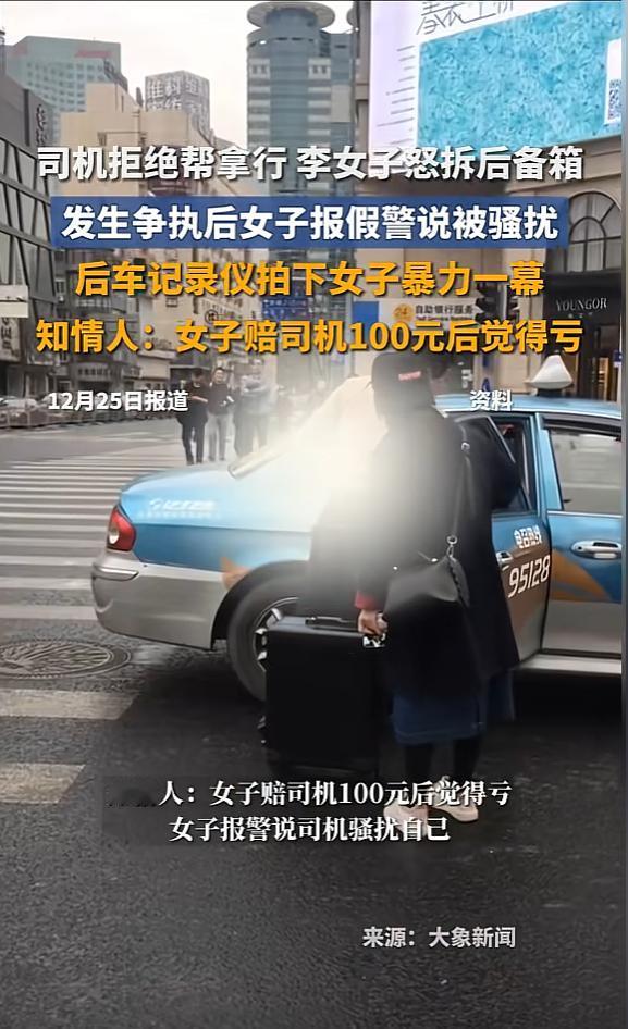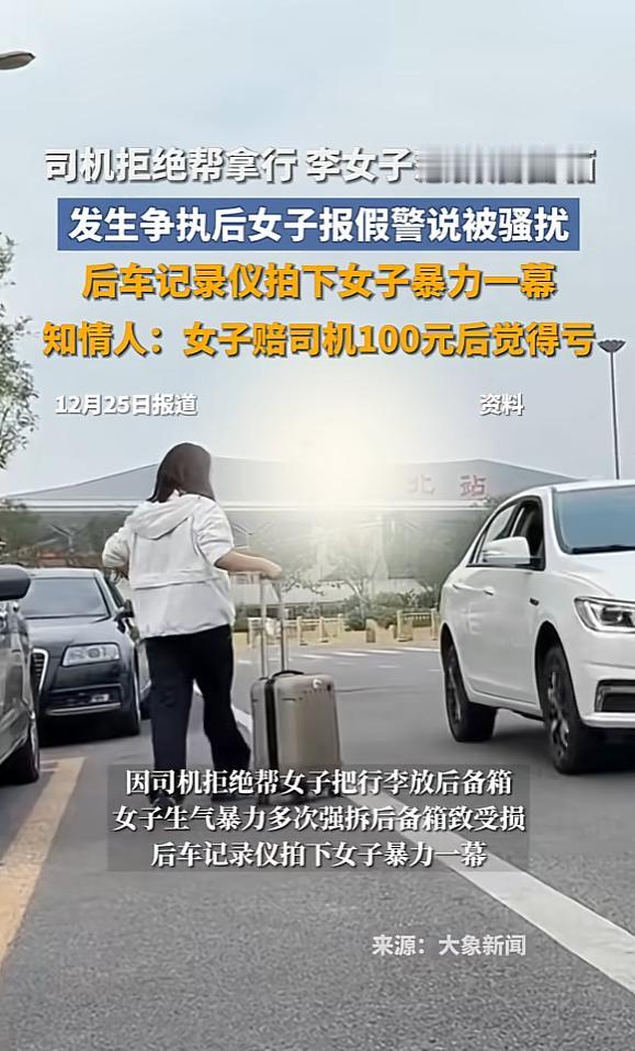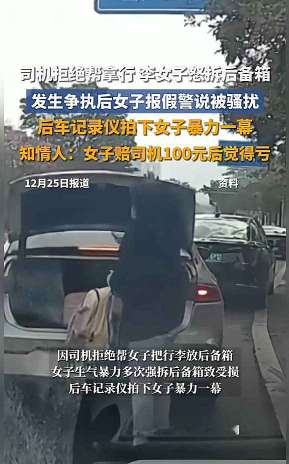 “丢人丢大了!”12月24日,广东,一女子在路边打车,想让司机帮忙放行李却被拒绝,于是开始强拆后备箱泄愤,导致车辆受损,赔偿司机100元后觉得太亏,竟报警污蔑司机骚扰,不料经过都被后面车辆的行车记录仪拍下。网友:还敢冤枉人吗? 事情的起因很简单,就是一次再平常不过的打车经历,当天女子在路边拦停了一辆出租车,带着不少行李,满心指望司机能下车帮她把行李塞进后备箱,其实这事说起来,司机帮忙是情分,不帮是本分,没有哪条法律规定司机必须充当搬运工,顶多算是服务不够周到。 可女子却认了死理,觉得司机就该帮自己,或许是司机看行李不算多,或许是单纯不想动弹,最终回绝了她下车搬运行李的要求,这一拒绝瞬间点燃了女子的火气,她既没选择投诉也没换一辆车,反而把所有怒气都撒在了无辜的车辆后备箱上。 只见她径直走到车尾,既然司机不肯帮忙开后备箱、搬行李,她就自己动手,只不过动作里全是泄愤的意味。她抡圆了胳膊,对着后备箱门暴力撕扯、强行撬动,那股子蛮劲看得人侧目,等司机察觉到不对劲下车查看时,后备箱已经被她折腾得无法正常闭合,结构明显受损,彻底坏了。 破坏已经造成双方只能坐下来谈赔偿,司机的处理方式可以说相当宽容,一番交涉后,只让女子赔偿100块钱维修费,随后就放她离开了,要知道车辆后备箱结构受损,光维修工时费可能都不止100块,这分明是司机想大事化小、小事化了,给了她台阶下。 按说拿到这样的“友情价”赔偿,女子赶紧走人就完事了,这事也就翻篇了,可她离开后越琢磨越觉得亏,心里的不平衡感越来越强烈,觉得自己不过是发泄了一下,就要掏100块钱,实在不划算。鬼使神差之下,她居然拿起电话拨打了110,张口就颠倒黑白,污蔑司机对她进行了“骚扰”,要求司机反过来给自己赔偿。 她大概以为只要自己态度强硬、一口咬定,就能把白的说成黑的,不仅能要回那100块钱,还能占点便宜,可她千算万算,漏算了一个关键证据,后方车辆的行车记录仪,当时涉事车辆后方刚好跟着一辆车,行车记录仪不偏不倚,高清完整地拍下了整个过程。 从女子因要求被拒而暴怒,到她面目狰狞地暴力破坏后备箱,再到最后关上变形箱门离开,每一个细节都被记录得清清楚楚,视频里全程都是女子单方面泄愤搞破坏,压根没有她口中所谓的“骚扰”,司机自始至终都保持克制,没有任何不当行为。 民警接到报警后迅速介入调查,调取行车记录仪视频核实情况后,局面瞬间反转,女子的谎言在铁证面前不堪一击,像纸糊的窗户一样一捅就破,警方不仅没有采信她的污蔑,反而将注意力重新聚焦到车辆受损的事情上,既然她对之前100块钱的私了结果不满意那就公事公办。 这一下女子可就亏大了。民警要求她配合司机,前往正规维修店铺对车辆进行专业定损维修,但凡开过车的人都清楚,后备箱闭合机构受损,涉及钣金、锁扣变形等问题,去4S店维修的费用,远远不是当初那100块钱能打发的。 最终女子不仅要承担远超预期的高额修车费,还因为报假警、污蔑他人,在民警和监控镜头面前丢尽了颜面,人品底裤都输光了,原本一件100块钱就能了结的小事,愣是被她的无理取闹和贪心,酿成了丢人事迹被众人知晓的闹剧。 网友们看完纷纷调侃,这真是搬起石头砸自己的脚,本来司机已经够宽容了,她偏偏要作死冤枉人,如今丢人丢到全网都知道,纯属咎由自取,做人还是得讲道理、守本分,别总想着占便宜、颠倒黑白,不然最后只会自食恶果,落得个贻笑大方的下场。 (信息来源:《司机拒绝帮拿行,李女子怒拆后备箱,发生争执后女子报假警说被骚扰,后车记录仪拍下女子暴力一幕》荆楚网)