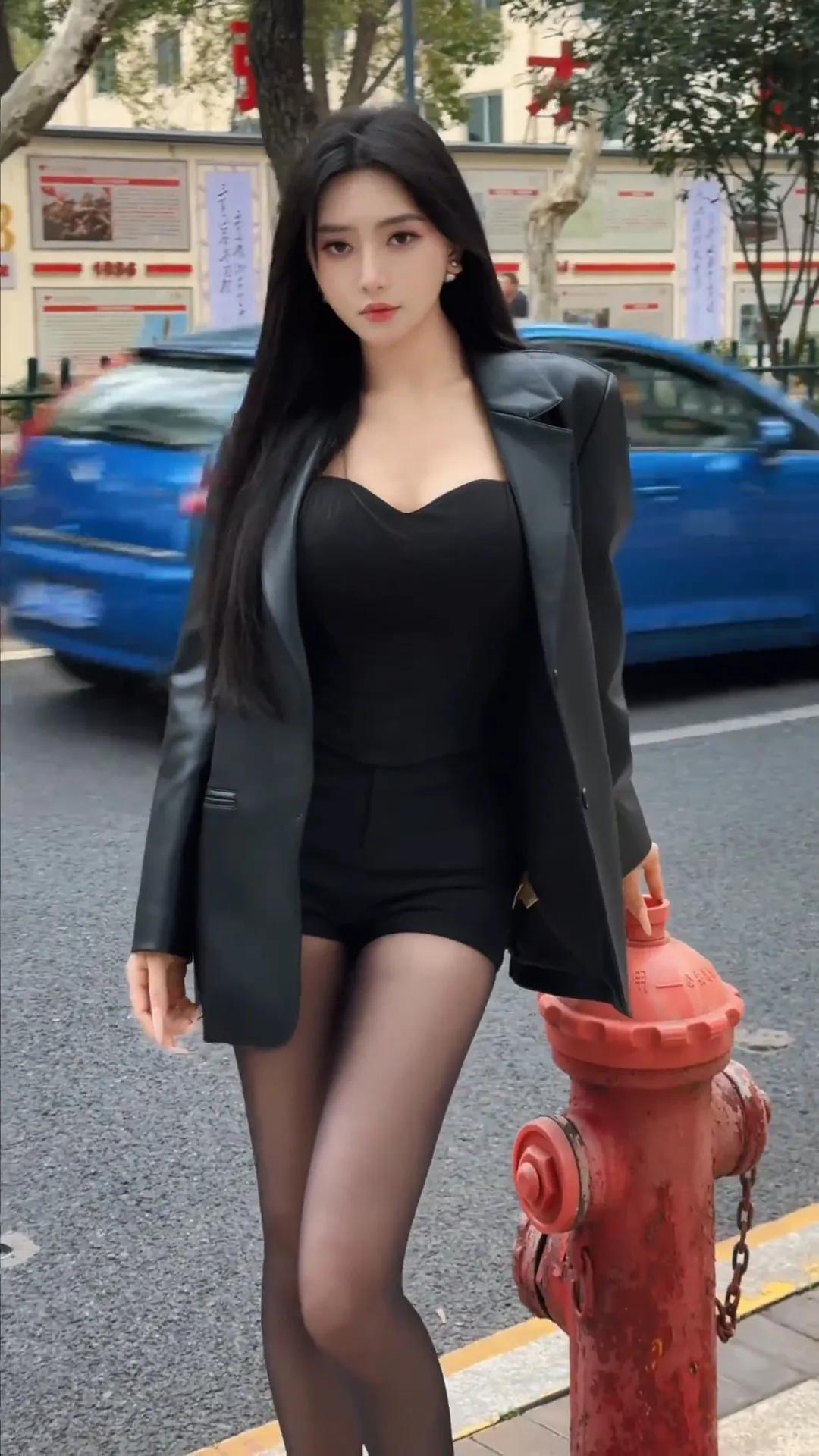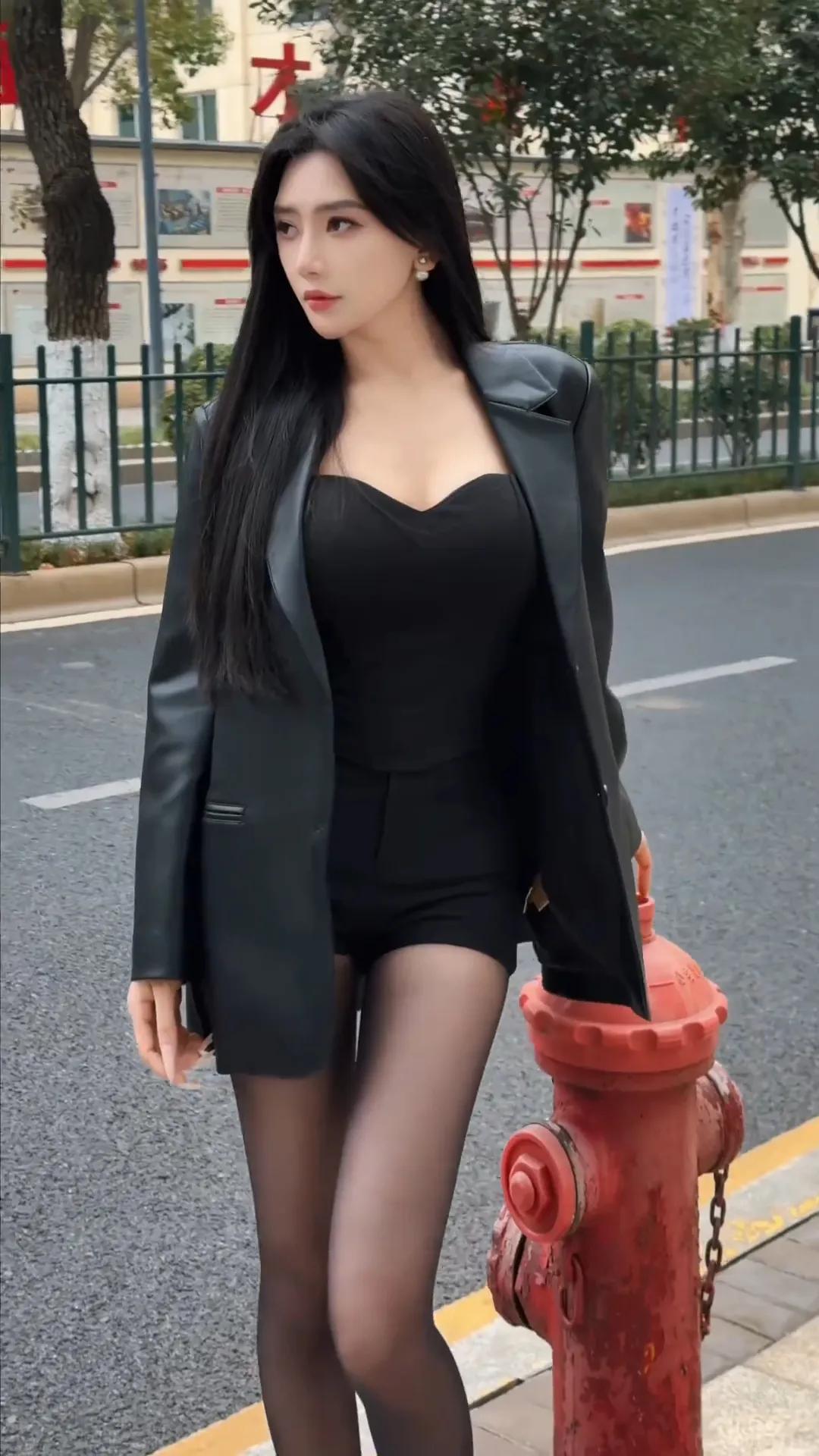 都市酷炫风,黑色皮衣搭配透视黑丝,街头时尚感十足!