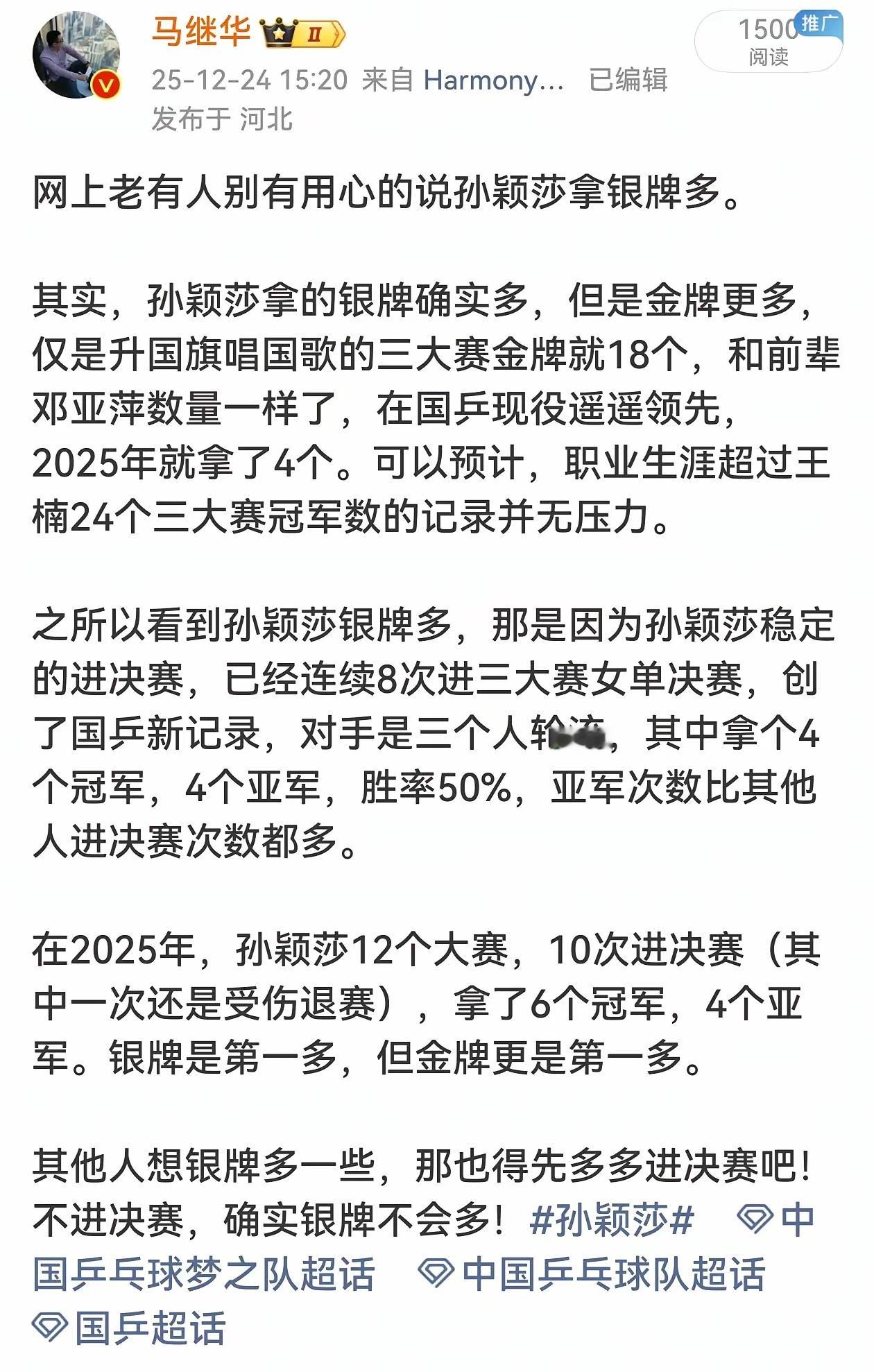 孙颖莎又冲上热搜了!567说不突出个人,不要注意明星运动员,但是莎莎的乒大声的告诉你:孙颖莎靠的是在球馆里日复一日、挥汗如雨的苦练,靠在赛场上每一次咬牙搏杀、永不放弃的瞬间,一拍一拍,实实在在地打到我们面前的。孙颖莎外战全胜!凭着那份“为国而战”时毫无保留的赤诚,始终如一的温暖与纯粹,无论胜败都坦荡从容、落落大方的气度走进球迷的心里。这也是我最爱她的理由把国家责任焊在信仰里这样的孙颖莎,你喜欢吗?
