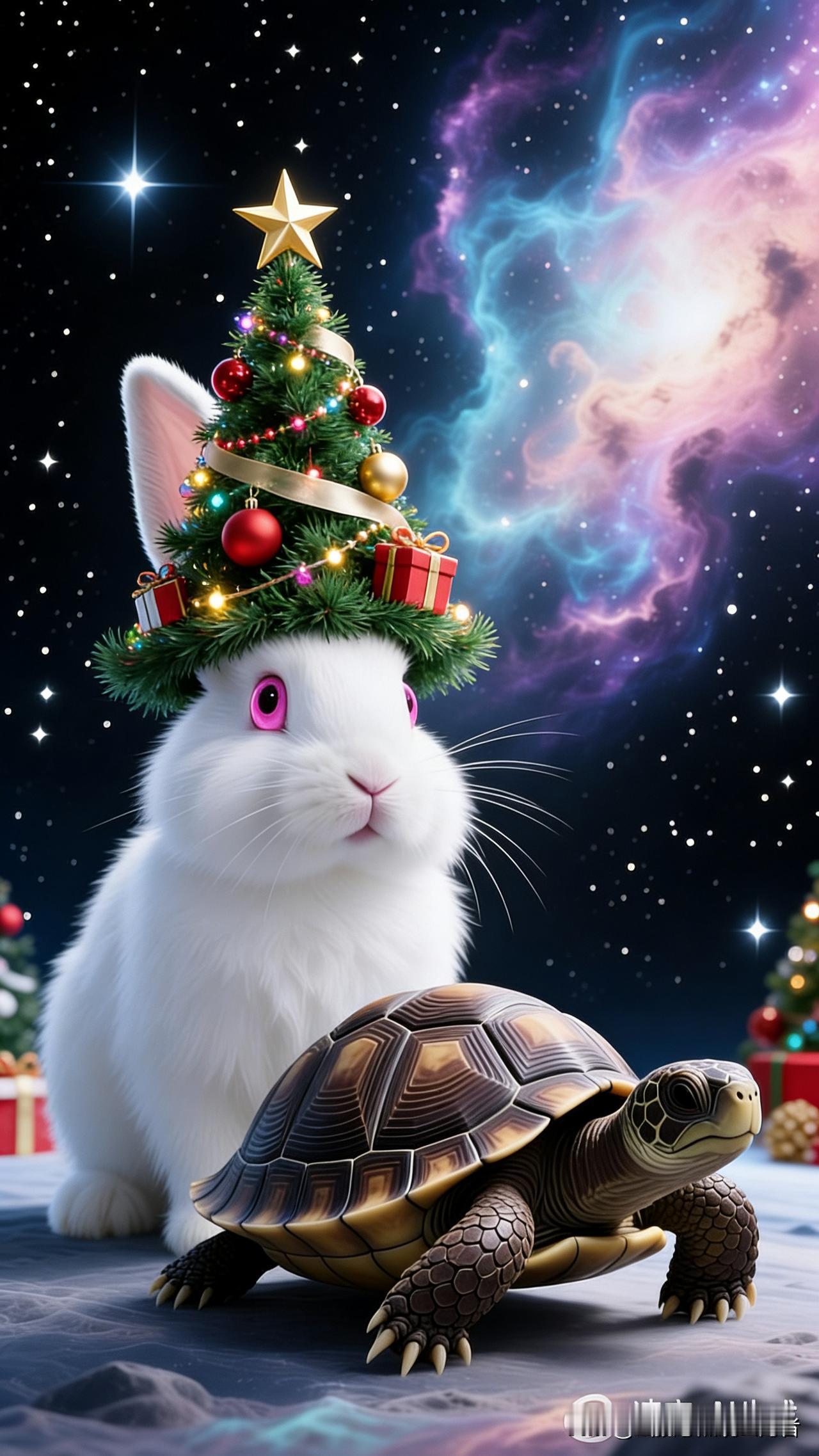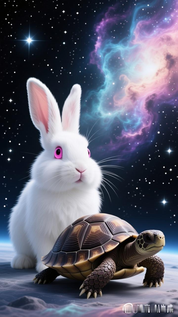 兔子和乌龟,永远在一起。谁能拒绝这么治愈的画面啊!雪白小兔攥着彩虹气球,旁边小乌龟戴着宇航员头盔,俩小家伙在星空里悠悠飘着,底下星球还铺着彩虹光带,星星、钻石似的亮片到处闪。就像生活里,总有快慢不同的伙伴陪着你,一起闯浪漫又未知的“宇宙”,看完心里软软的,烦恼都被冲没啦~