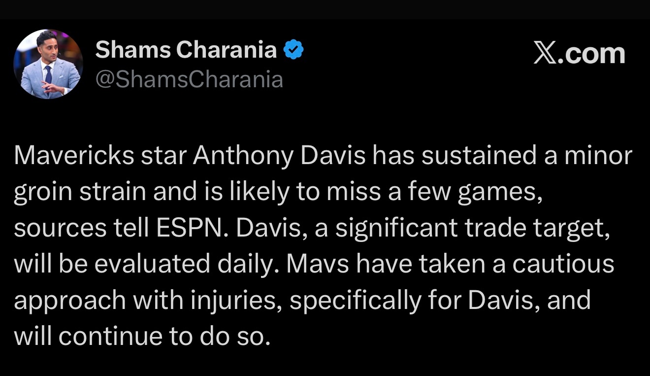Shams:安东尼·戴维斯遭遇轻微腹股沟拉伤,可能缺席几场比赛。戴维斯是球队的重要交易目标,球队将每天对其进行评估。独行侠在处理伤病问题上一直采取谨慎的态度,尤其是对戴维斯的伤情,并将继续如此。