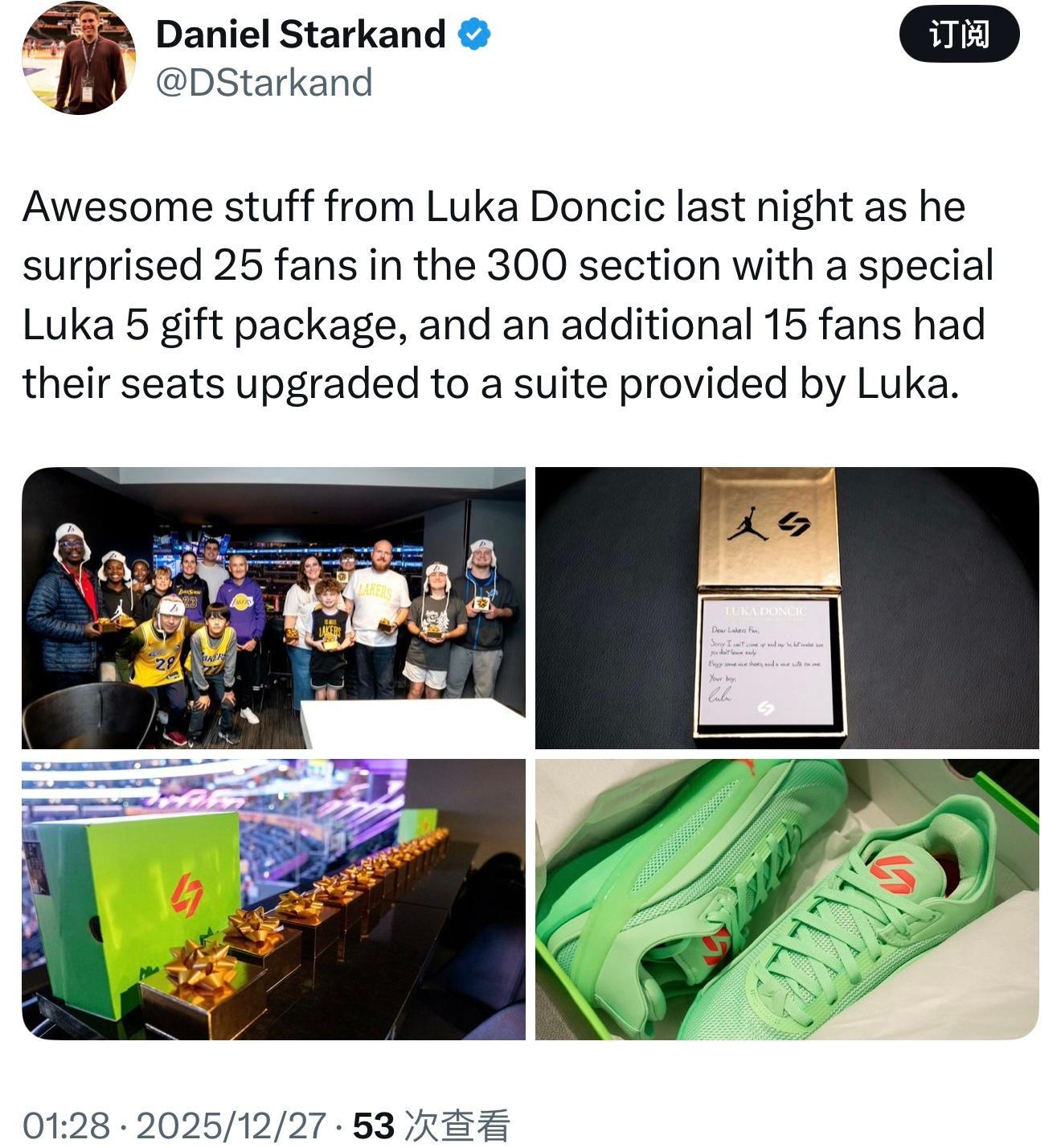 湖人记者:昨晚卢卡·东契奇的举动太棒了,他给坐在300区域的25位球迷带来惊喜,赠送了特别版卢卡5代礼包,并且额外将15位球迷的座位升级至由卢卡提供的豪华包厢席位。