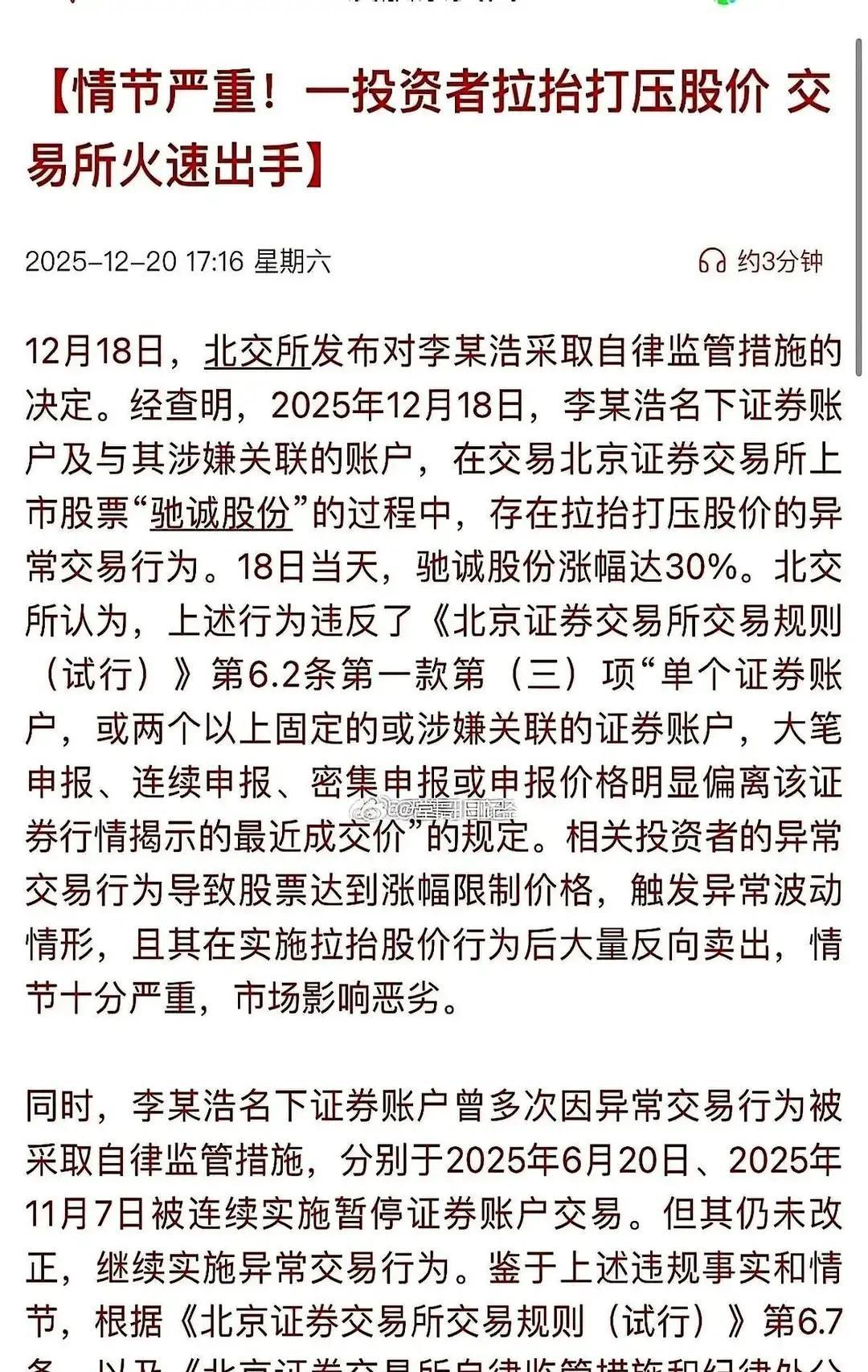 玩量化的哥们收盘前最后一秒砸了25亿买单,把指数瞬间顶高,下一秒又全撤了。 监管直接锁定账户,原来是个私募小老板,平时靠算法薅流动性羊毛,这回薅到老虎头上。 听说他以前就爱尾盘搞脉冲,系统里留了一堆前科,这次金额太大,交易所机器直接报警。 办公室被敲门那一刻,估计他才明白,键盘敲得再快也快不过手铐。 现在账户冻结、资产受限,圈里都在传“终身禁入+天价罚单”套餐已备好。 靠代码耍小聪明,把市场当提款机,最终提走的是自己的人生。