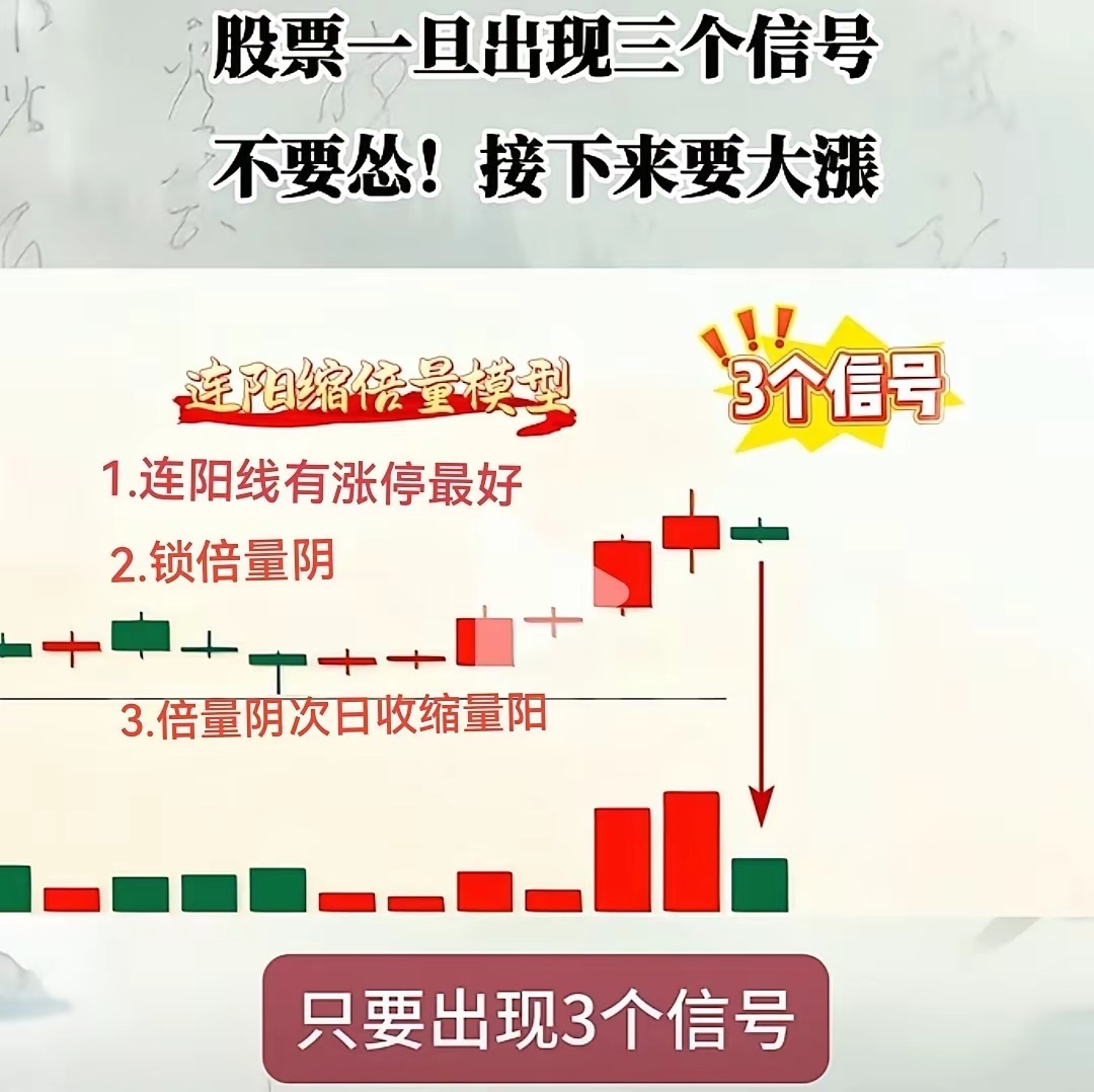 连阳缩倍量模型这是短线量价战法,核心是连阳建仓→缩倍量洗盘→倍量突破,抓主力拉升起点,常见于底部或上升中继。结构:1. 连阳建仓段:连续4-5根以上阳线,碎步上行、依托5日均线,最后1根为阶段最大量,确认主力进场。2. 缩倍量洗盘段:连阳后小幅调整横盘或微跌,量能缩至连阳最大量的一半以下,缩量越极致越好,代表浮筹洗净。3. 倍量突破段:洗盘后出现倍量阳线,收盘价站上调整平台上沿,反包调整K线实体,确认洗盘结束、拉升启动。