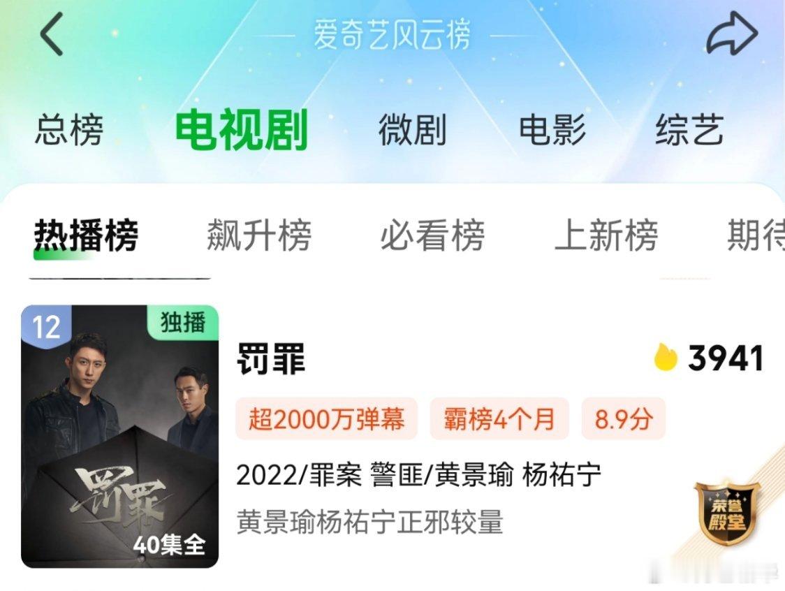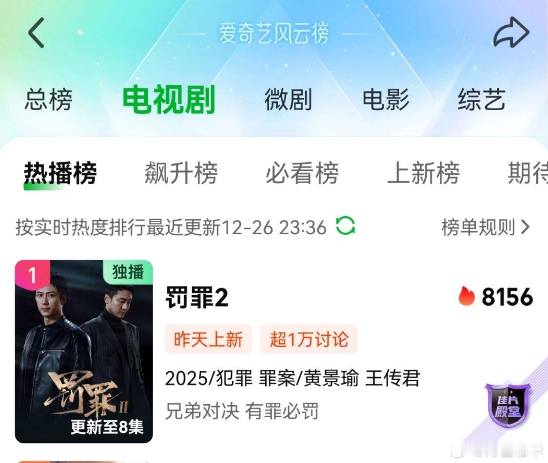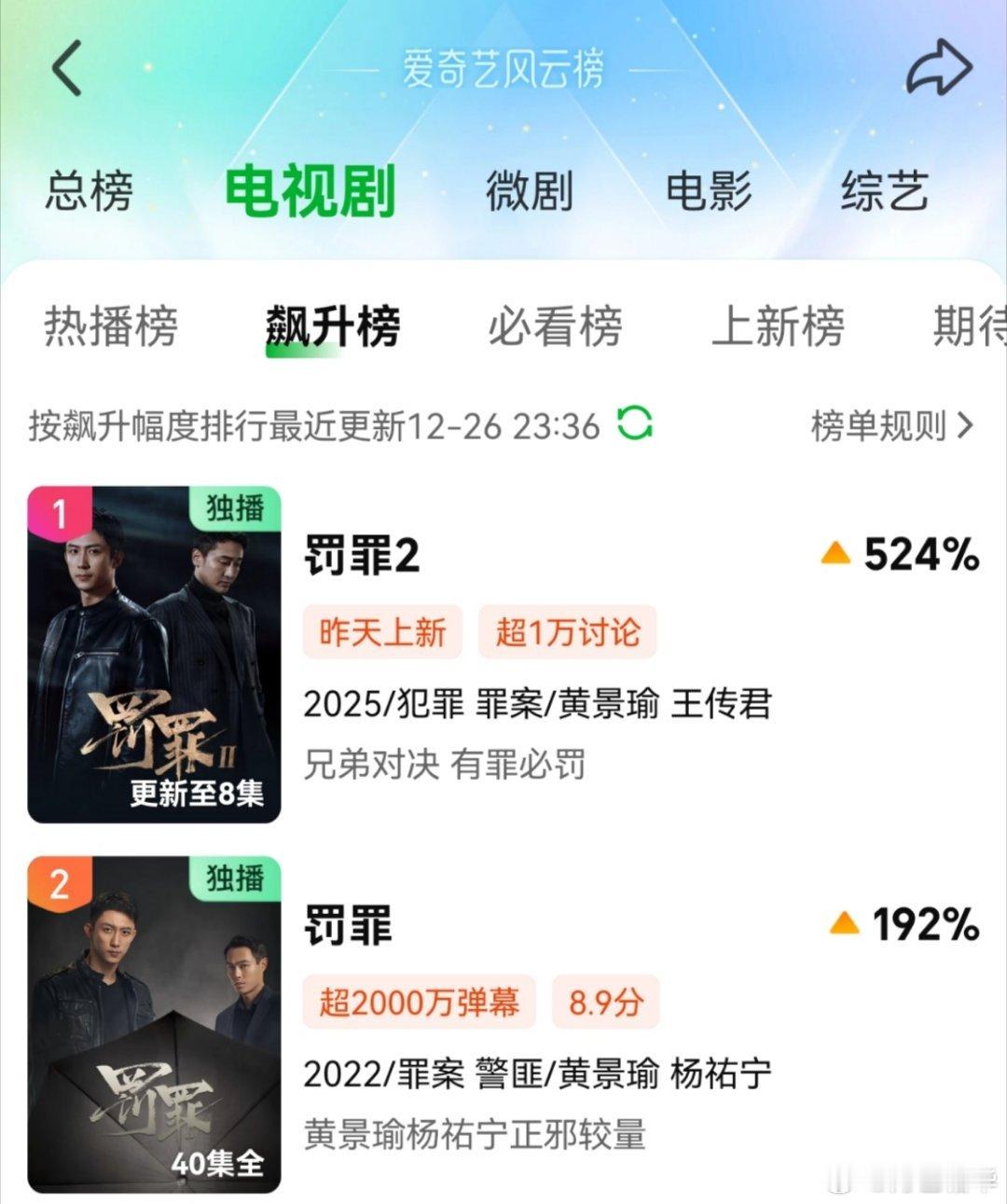 黄景瑜罚罪2黄景瑜秦枫今天的成绩,第一部都快到前十了。第二部在平衡这种长篇犯罪