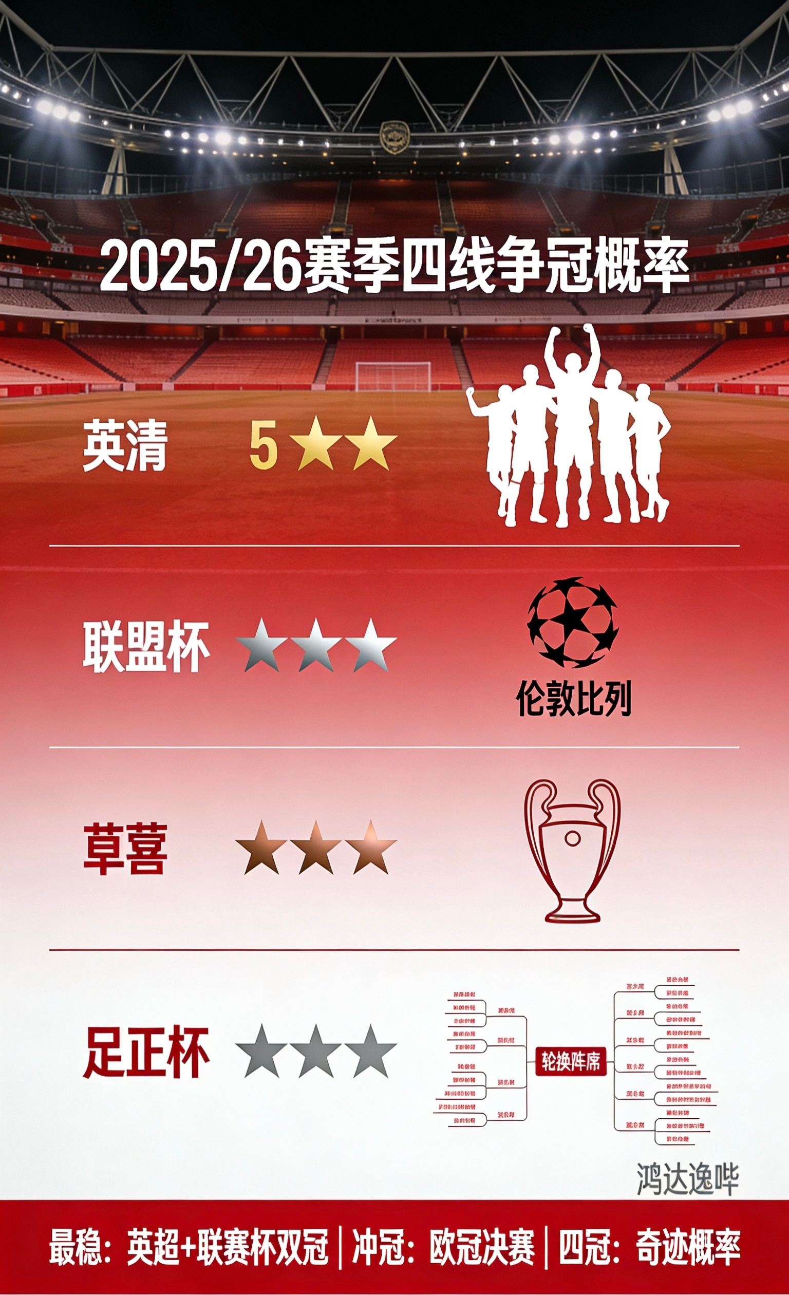 阿森纳各线夺冠概率与关键判断• 英超(概率最高):17轮39分领跑,领先曼城2分、维拉3分。阵容深度与防守稳定(多场零封),但后半程曼城追分能力强,还要碰利物浦、维拉等硬仗,容错率低。若稳住节奏,英超是最稳一冠。• 联赛杯(次高):四强战切尔西,伦敦德比战意拉满。联赛杯赛程短、对手强度相对可控,半决赛分两回合,赢下即可冲决赛,拿下概率高,适合先拿杯赛建立信心。• 欧冠(中上):小组赛6战18分强势,但淘汰赛对手(如拜仁、皇马等)更强。多线作战体能与伤病风险上升,争冠需超稳定发挥+些许运气。• 足总杯(中等):第三轮对朴茨茅斯(英冠),晋级不难,但后续多线冲突时易被战略性轮换,优先级低于英超/欧冠/联赛杯。